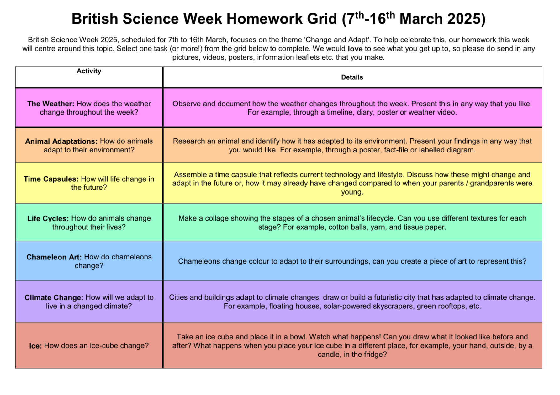 This week is British Science Week. Please see attached this week’s homework which focuses on this theme.