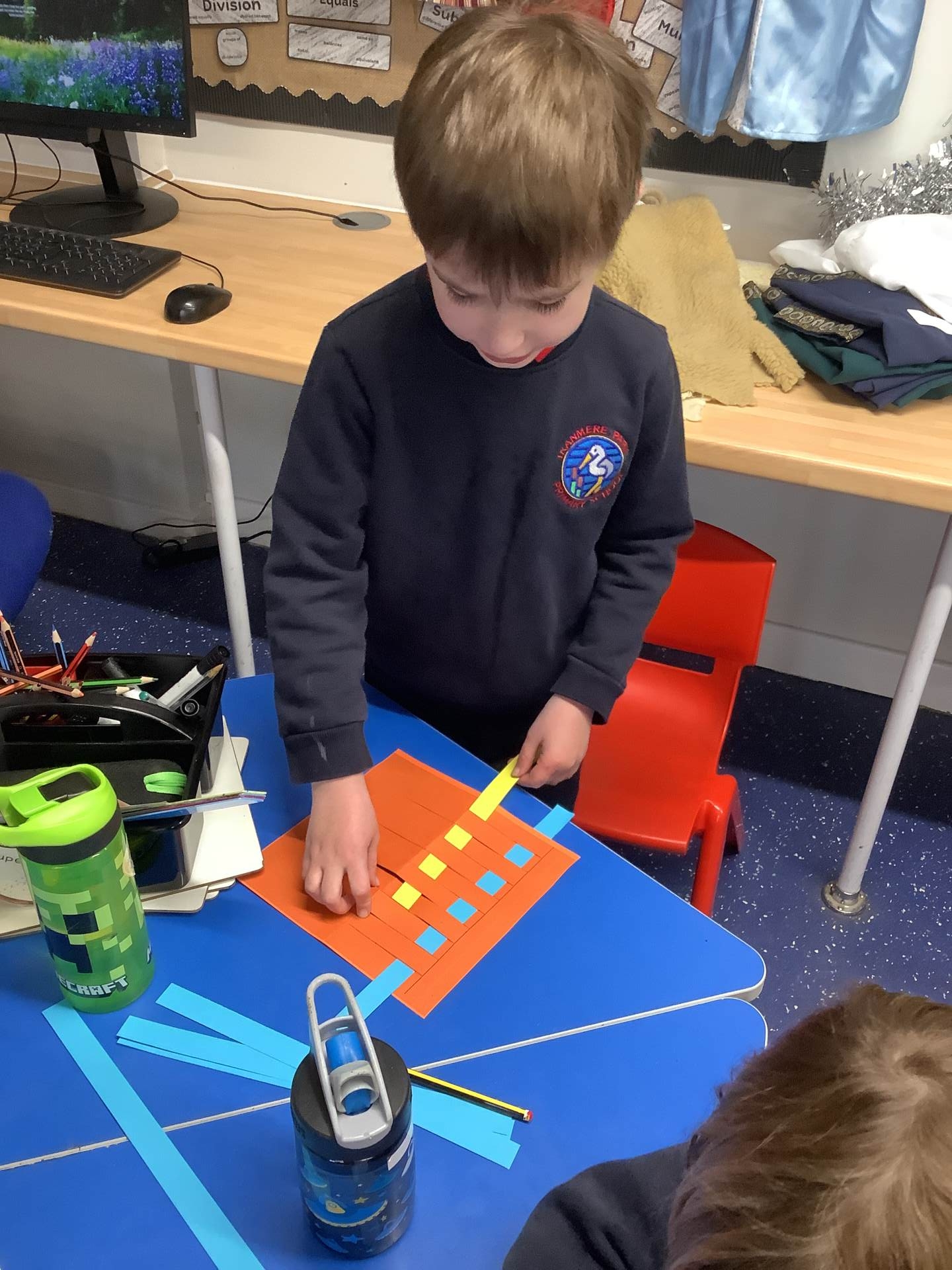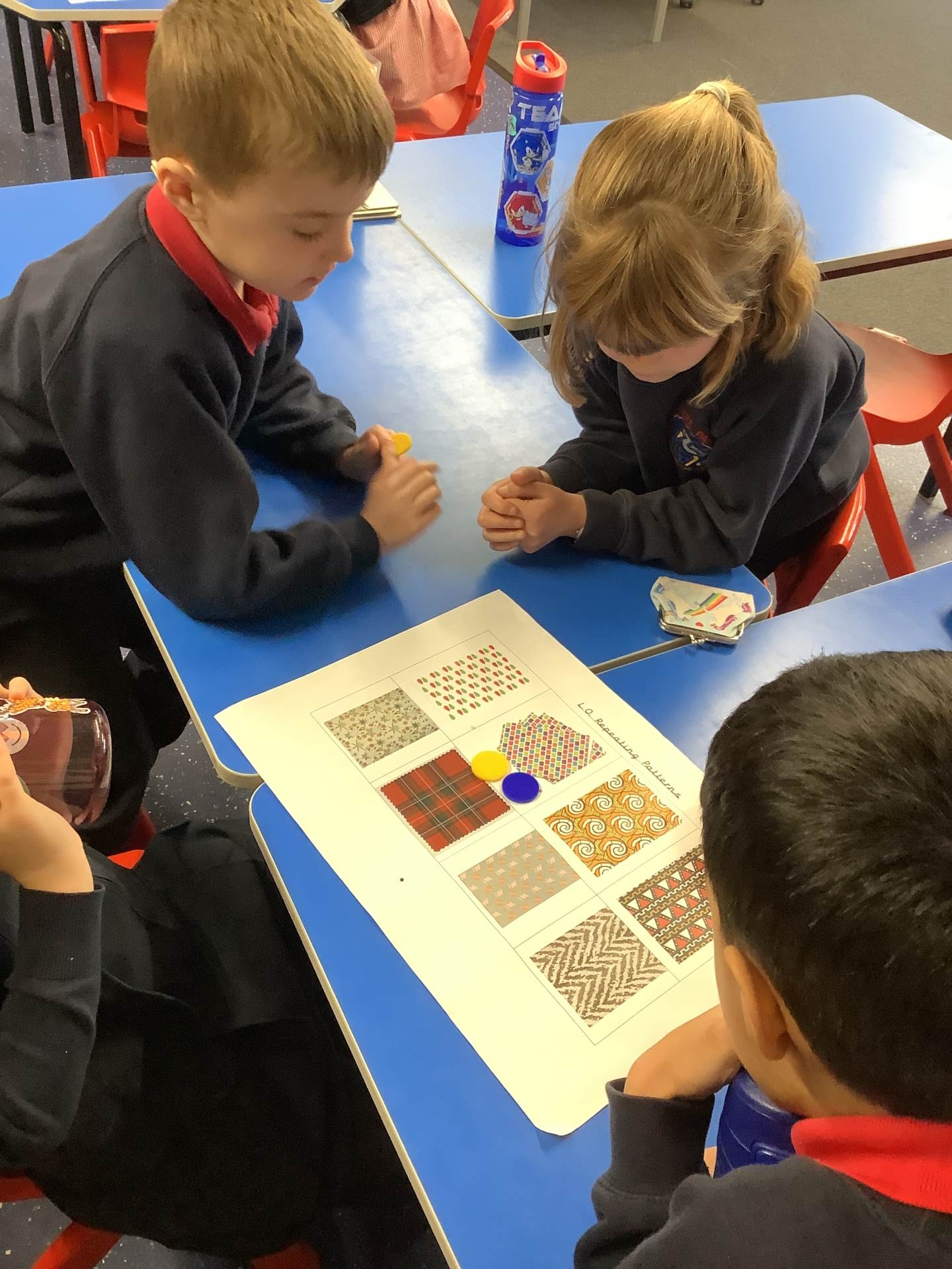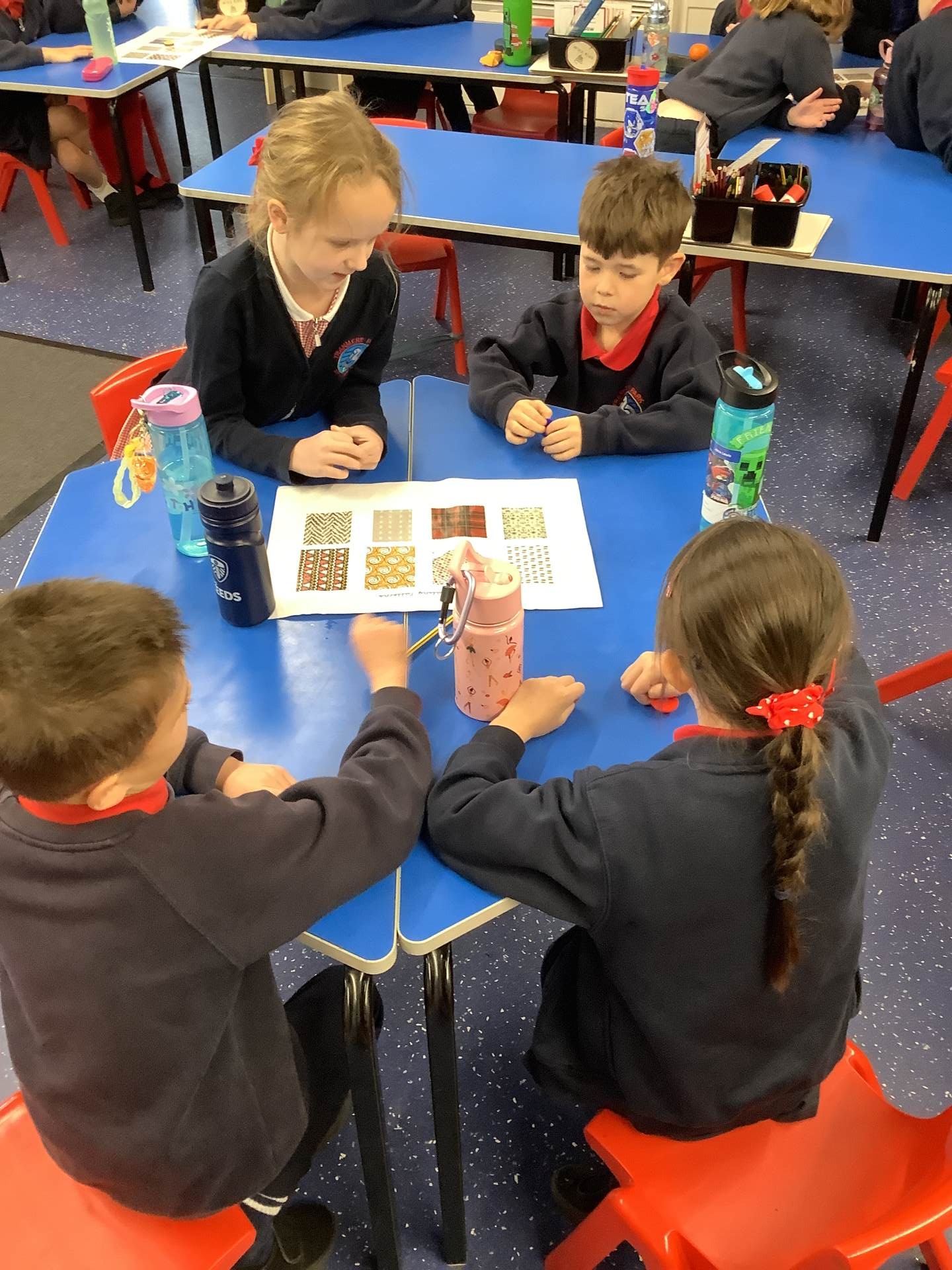 We have learnt different techniques such as stamping, fringing, coiling and rolling. During this topic, we have also looked at repeating patterns. We used counters to take turns identifying the patterns we could see and then built on what our friends had already identified.