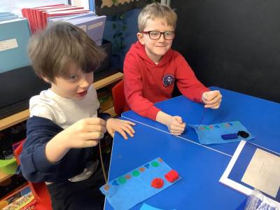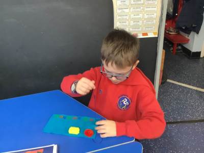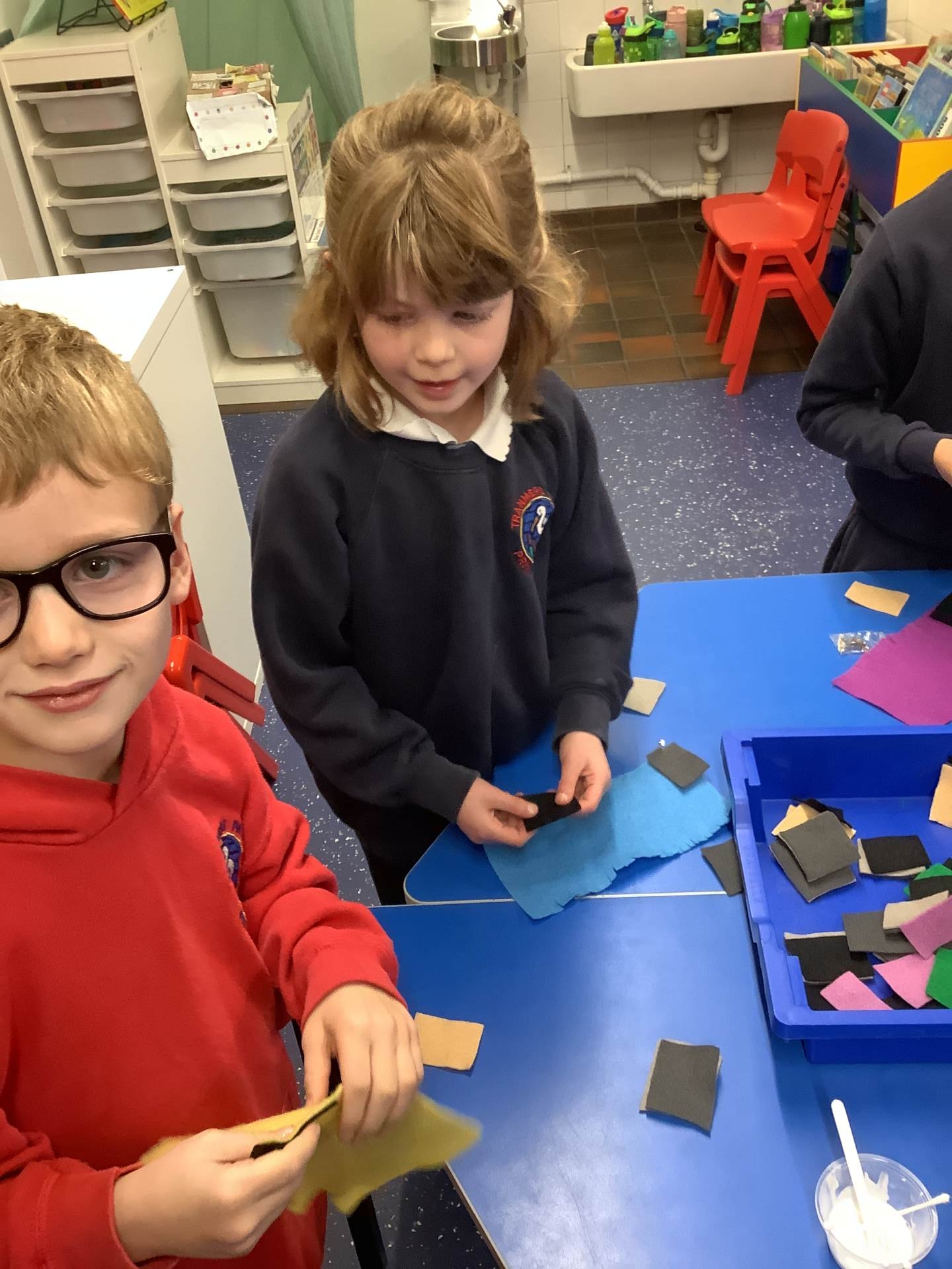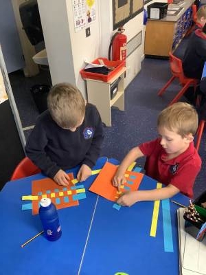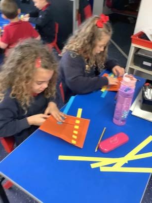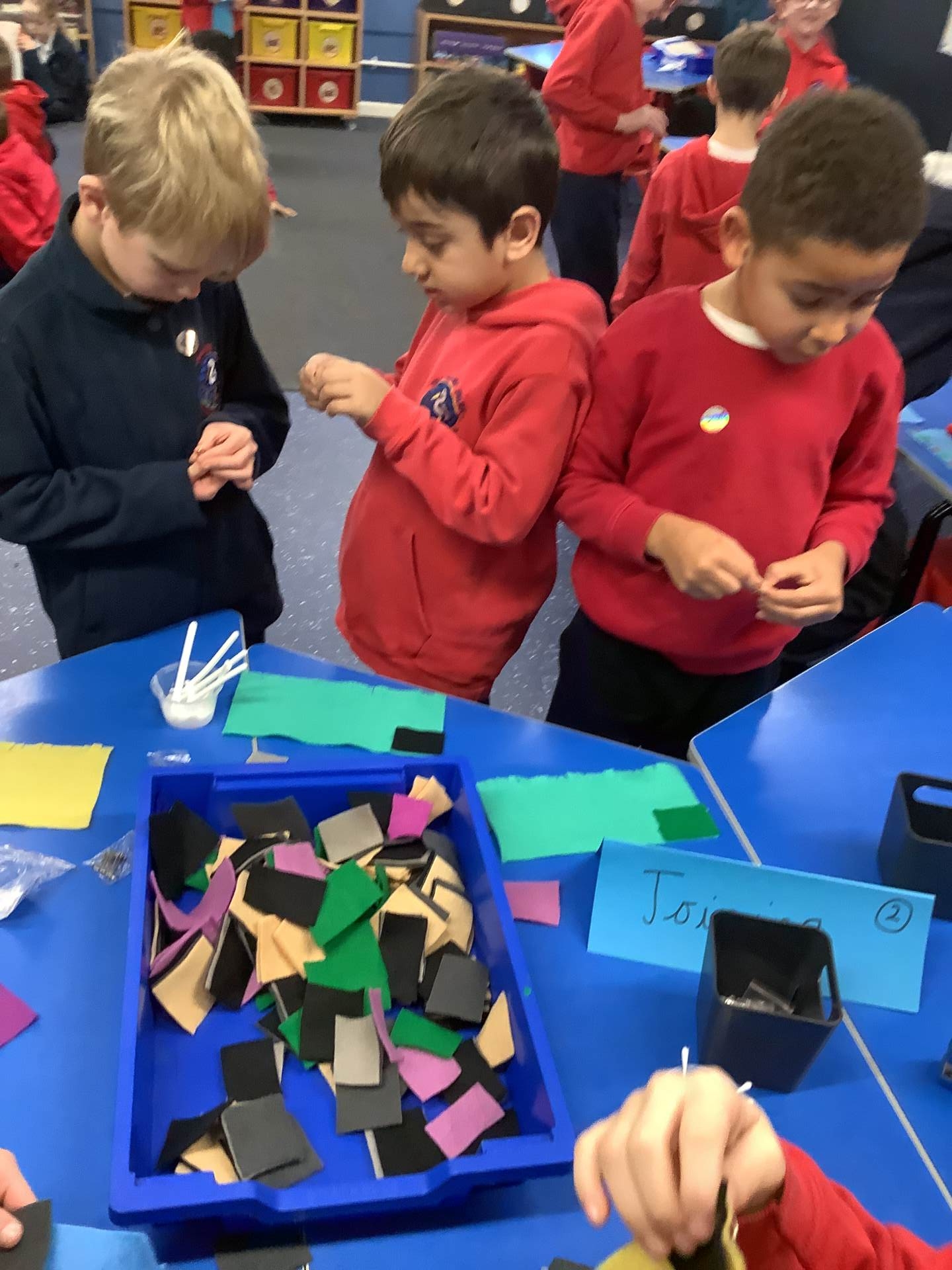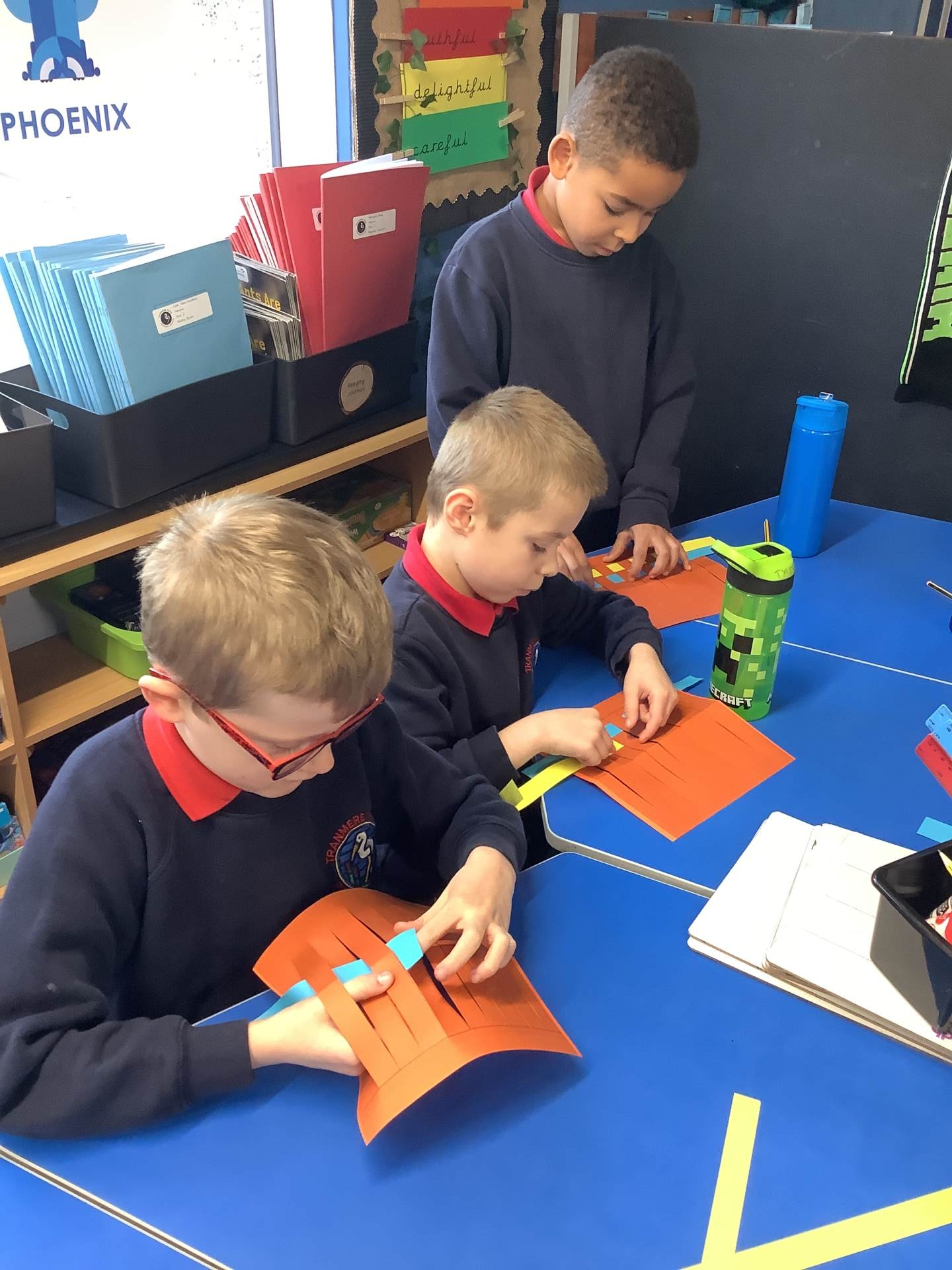 We have learnt different techniques such as stamping, fringing, coiling and rolling. During this topic, we have also looked at repeating patterns. We used counters to take turns identifying the patterns we could see and then built on what our friends had already identified.
