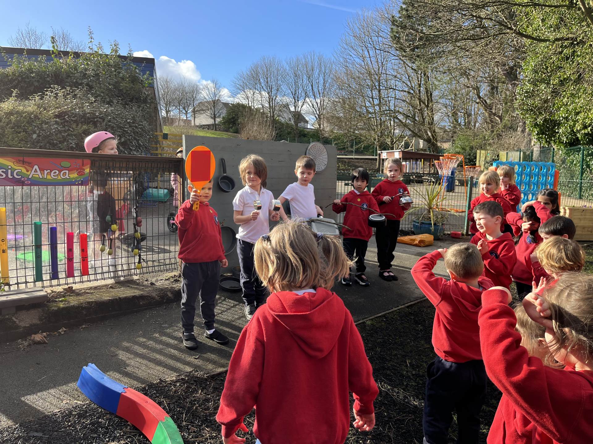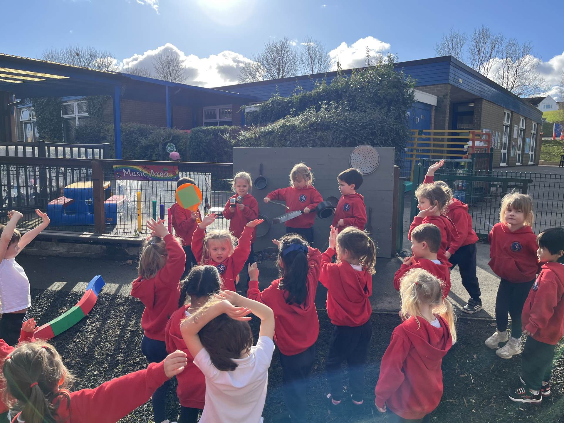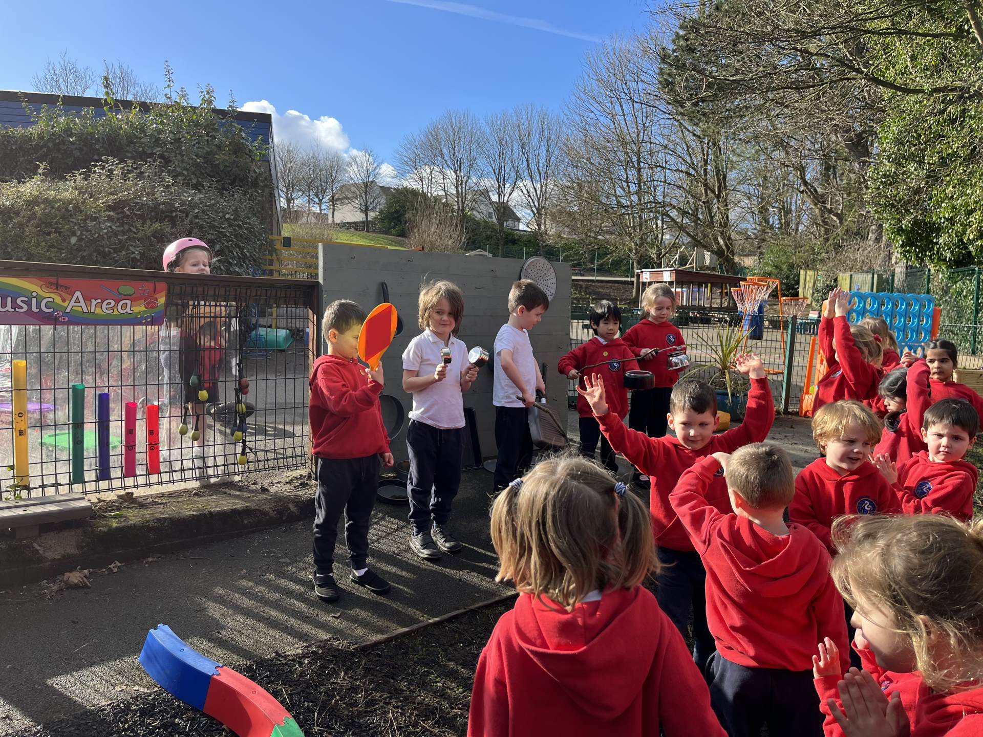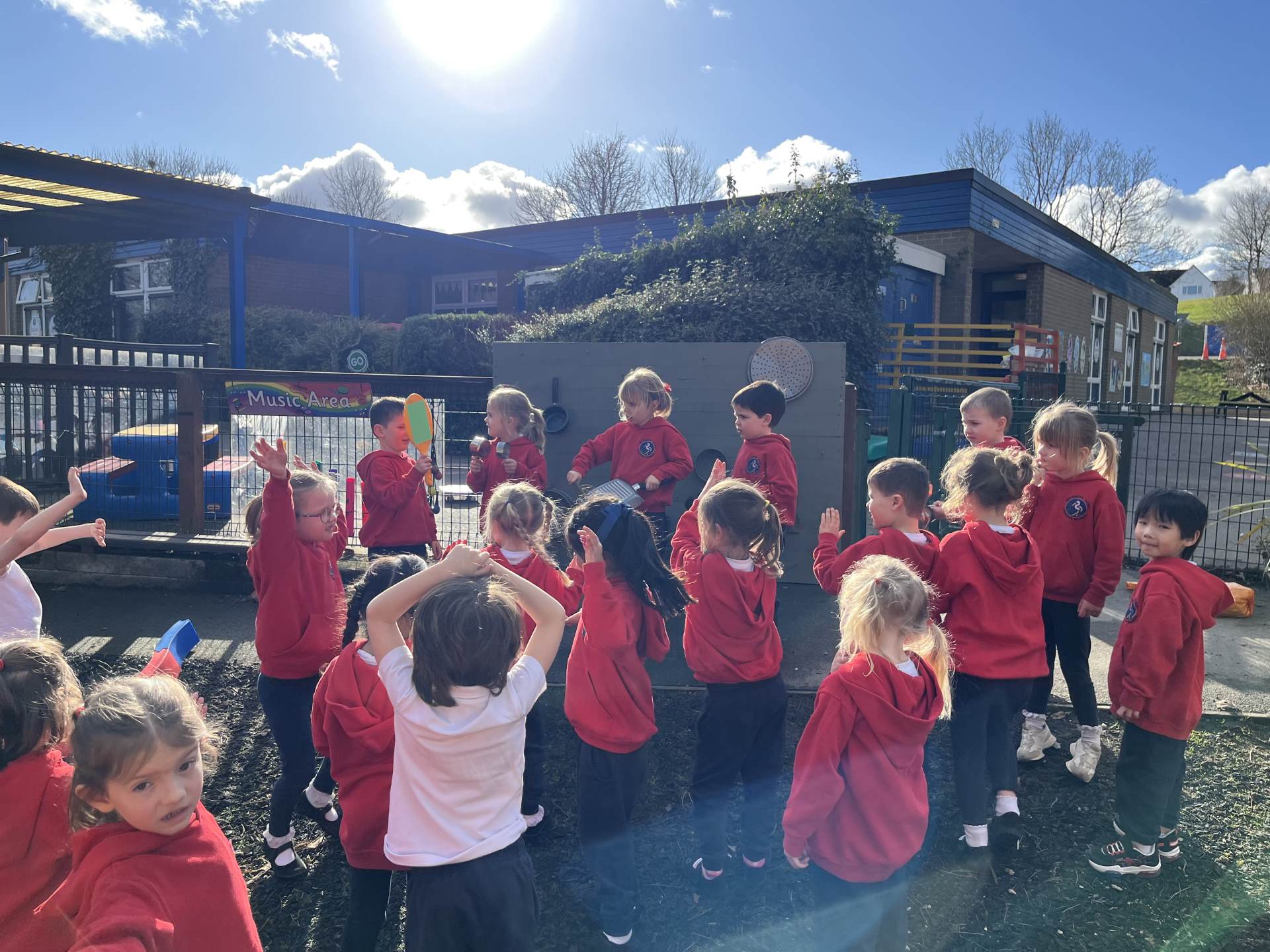 During music this afternoon, Reception were treated to a special session with Mrs.Holland. They had so much fun playing their new music game, that afterwards, they decided to try it outside on their music wall. After a little chat about how they could play their new game outside, they decided to create a concert! They chose their band members and instruments, band leader (with the stop and go sign) and audience. When the band leader showed the green side of the paddle, the band played and the audience danced, then when the leader showed the red side of the paddle, the band and audience stopped!