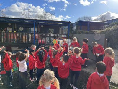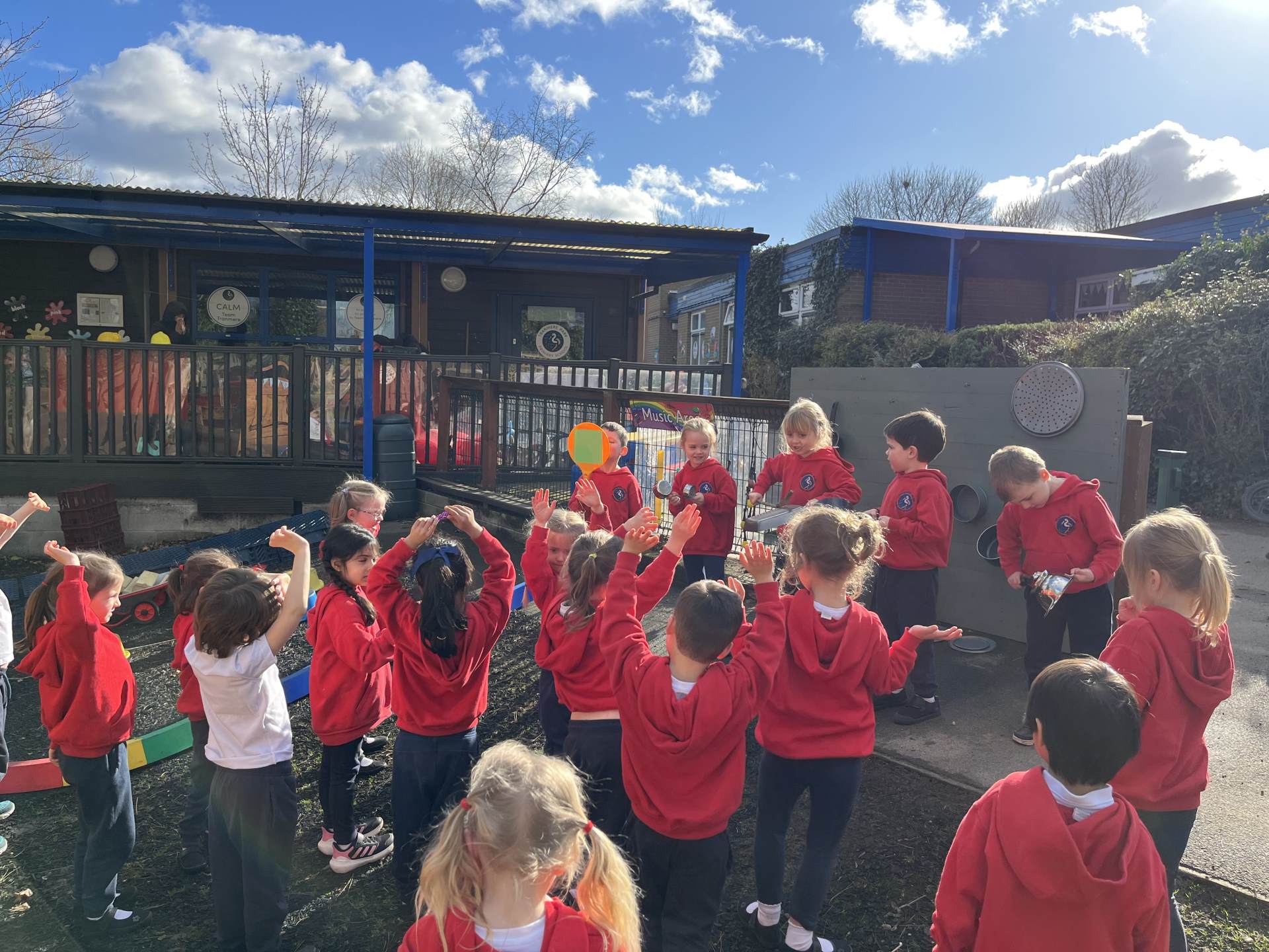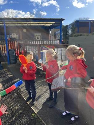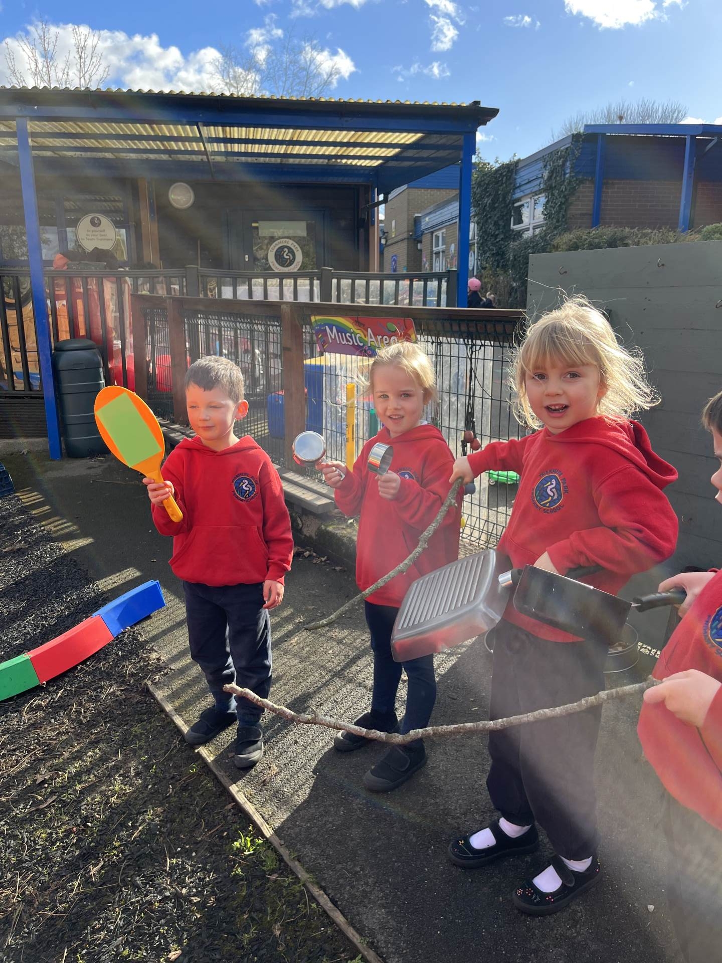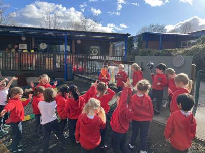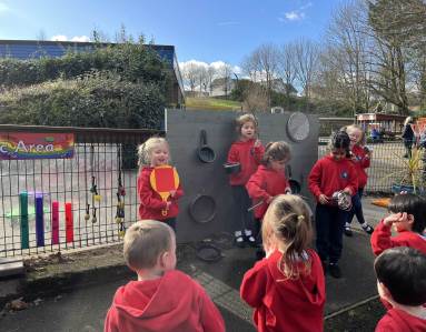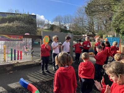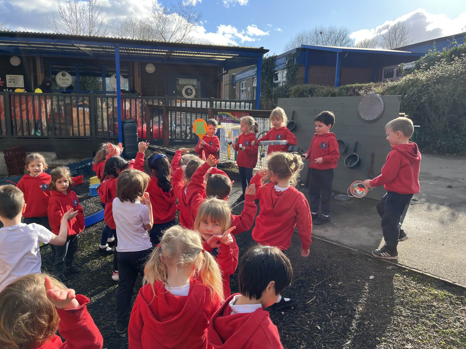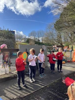 During music this afternoon, Reception were treated to a special session with Mrs.Holland. They had so much fun playing their new music game, that afterwards, they decided to try it outside on their music wall. After a little chat about how they could play their new game outside, they decided to create a concert! They chose their band members and instruments, band leader (with the stop and go sign) and audience. When the band leader showed the green side of the paddle, the band played and the audience danced, then when the leader showed the red side of the paddle, the band and audience stopped!