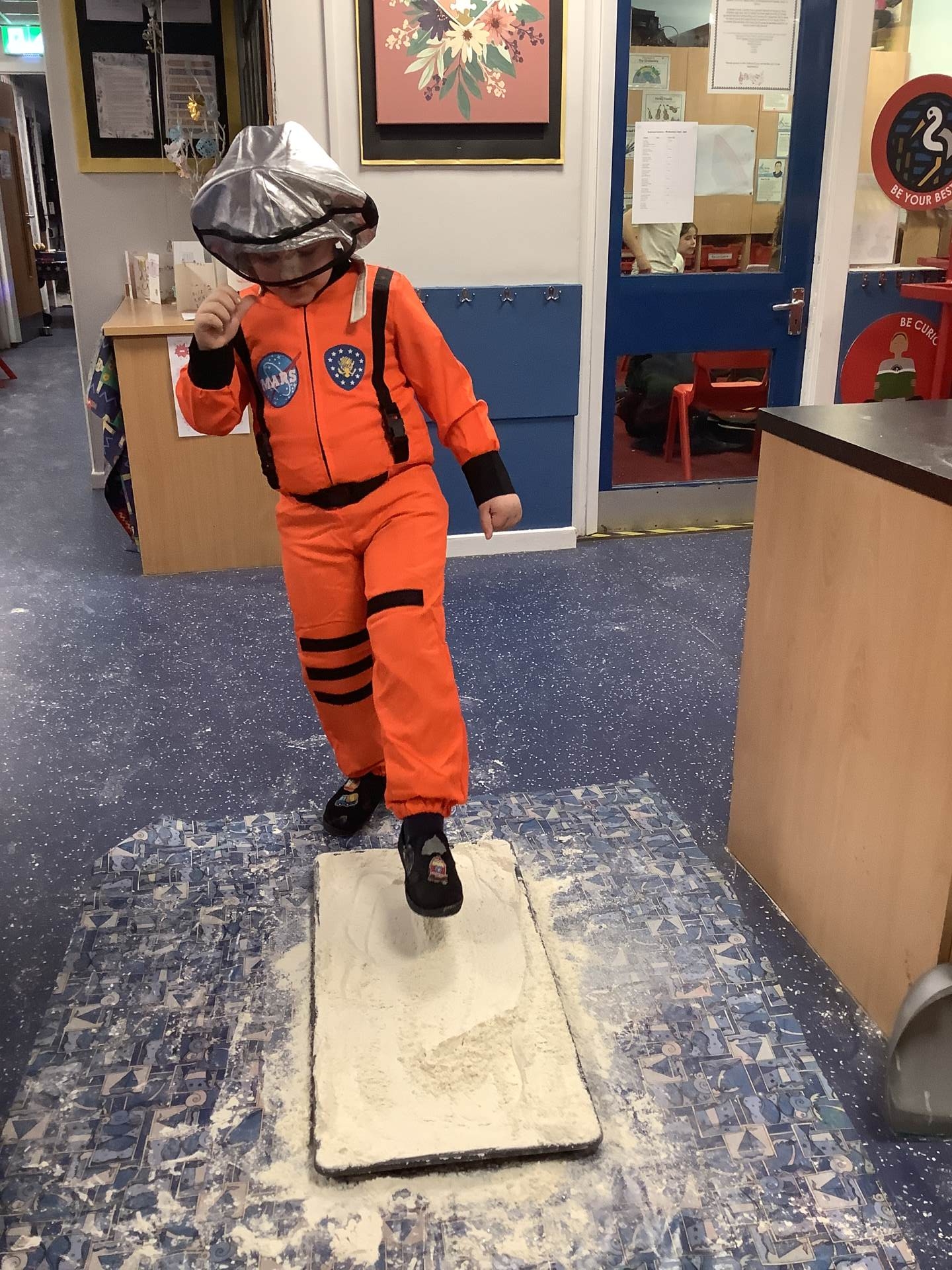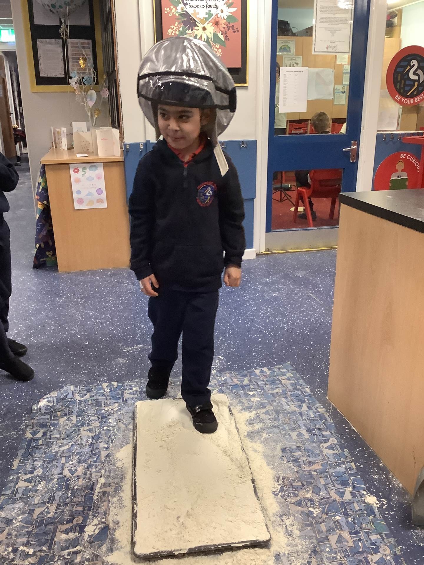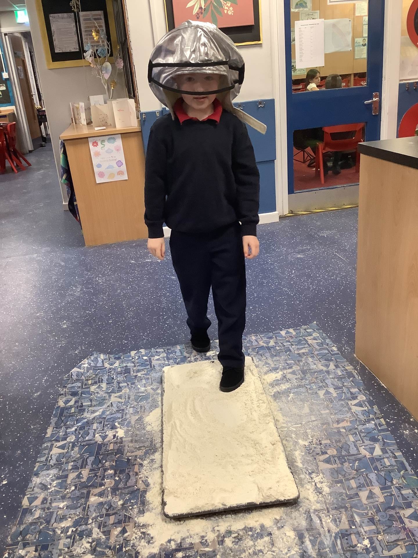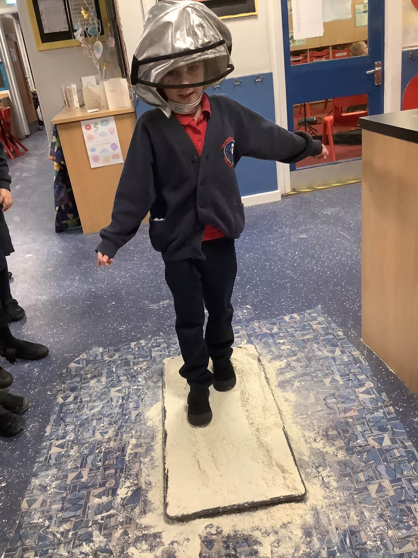 Over the last few weeks, Eagles class have been learning about the events of the First Moon Landing. To bring our learning to life, the children took their own steps on the moon's surface through role play. We used flour to imitate the surface of the moon and as the children stepped onto it, they said Neil Armstrong's famous words - "that's one small step for man, one giant leap for mankind." The children took their roles very seriously and said his famous words with great enthusiasm. We discussed how Neil Armstrong's footprints are still on the moon today as there is no wind on the moon. The children thoroughly enjoyed this fun (and slightly messy) experience!