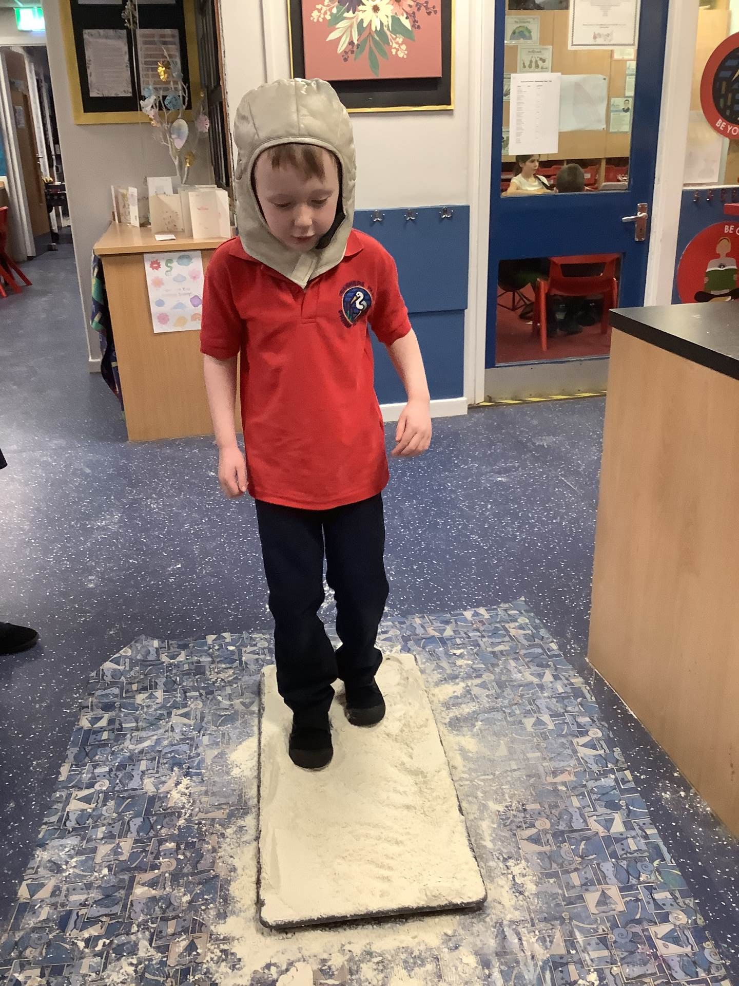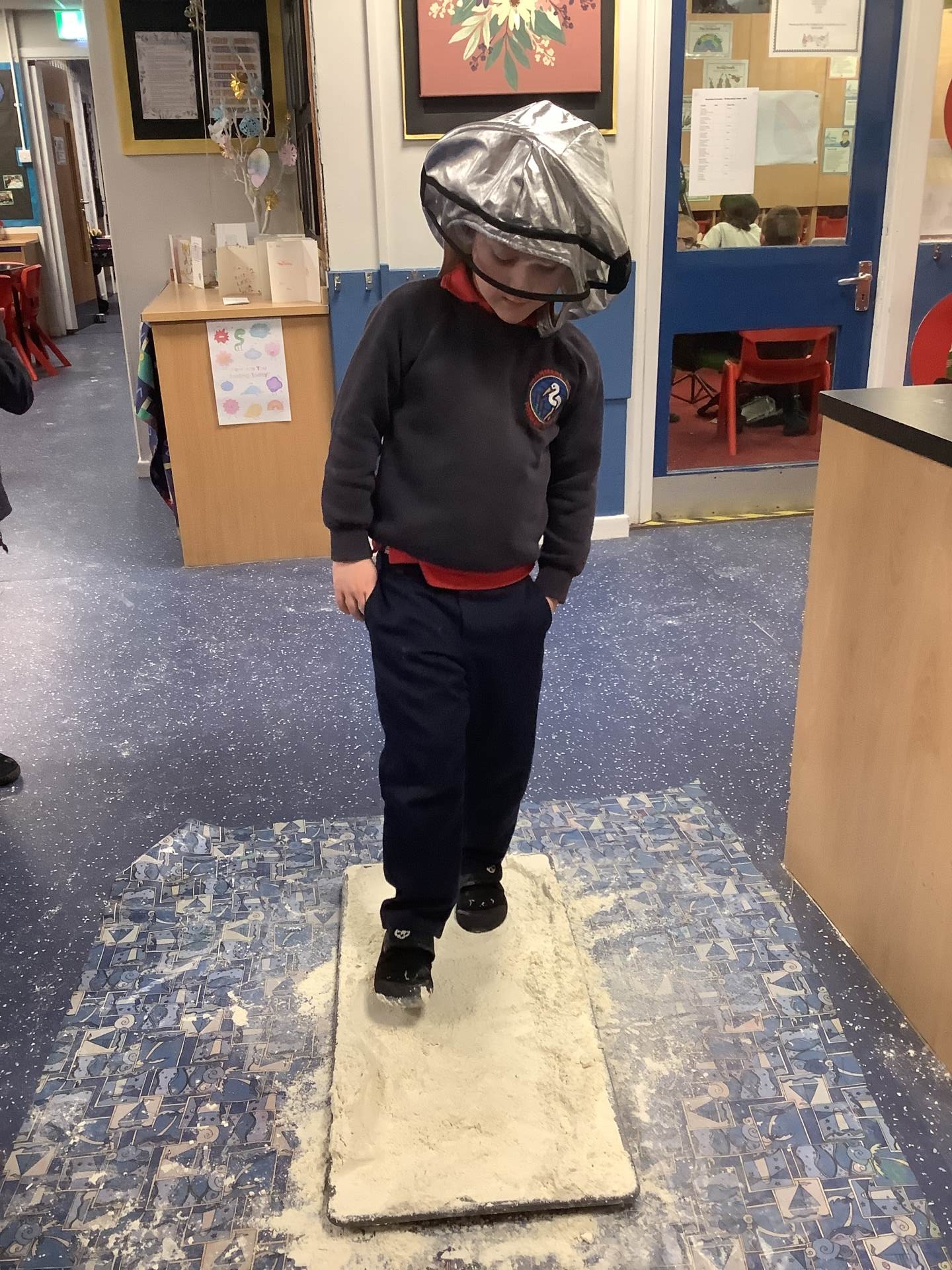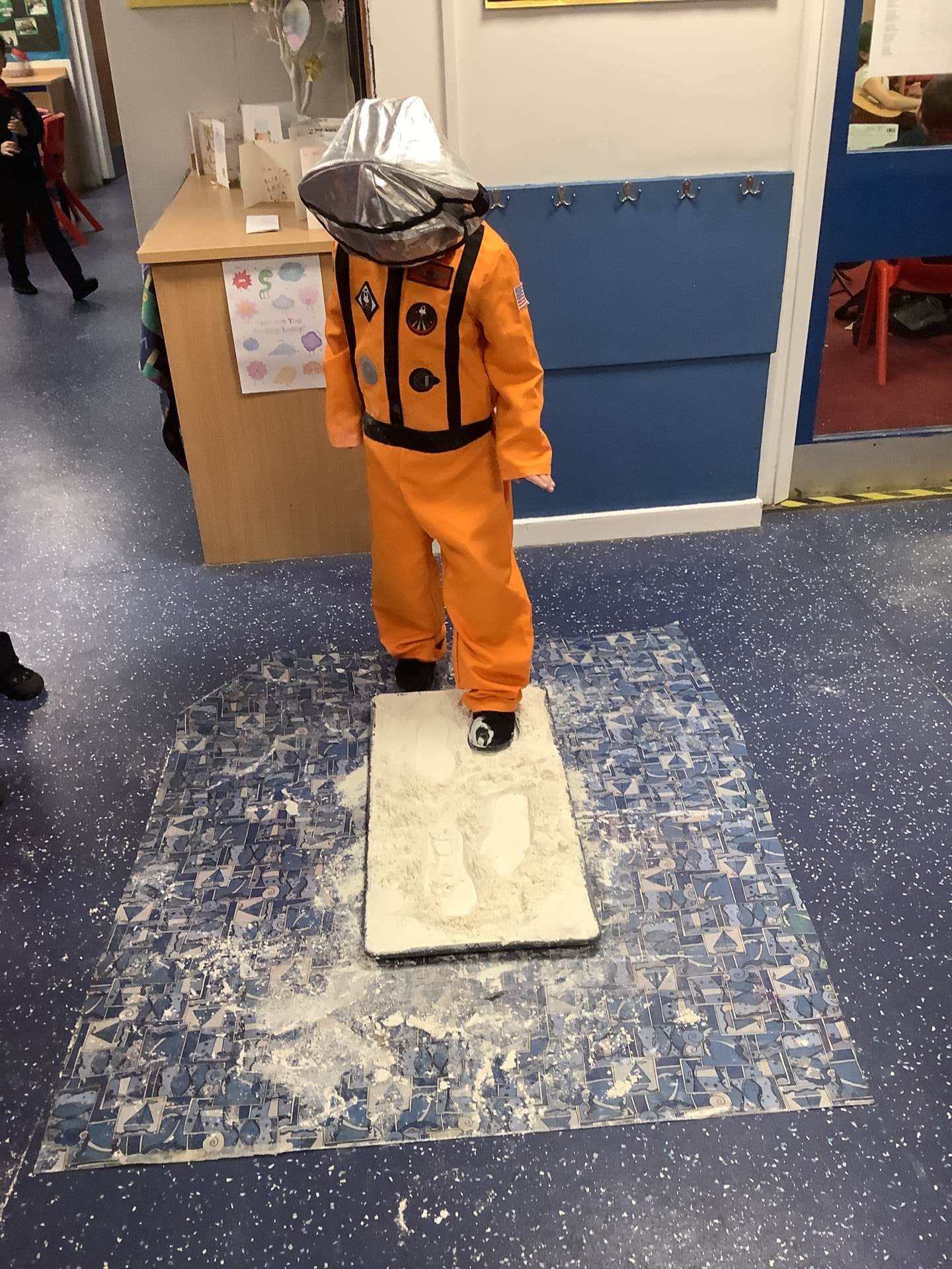 Over the last few weeks, Eagles class have been learning about the events of the First Moon Landing. To bring our learning to life, the children took their own steps on the moon's surface through role play. We used flour to imitate the surface of the moon and as the children stepped onto it, they said Neil Armstrong's famous words - "that's one small step for man, one giant leap for mankind." The children took their roles very seriously and said his famous words with great enthusiasm. We discussed how Neil Armstrong's footprints are still on the moon today as there is no wind on the moon. The children thoroughly enjoyed this fun (and slightly messy) experience!