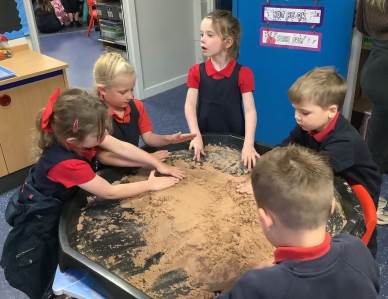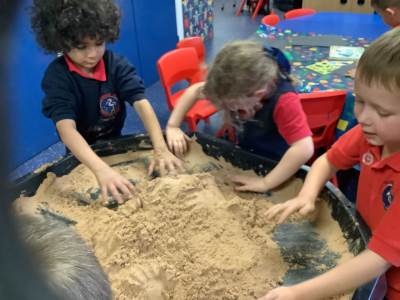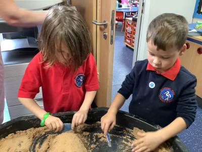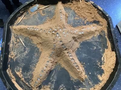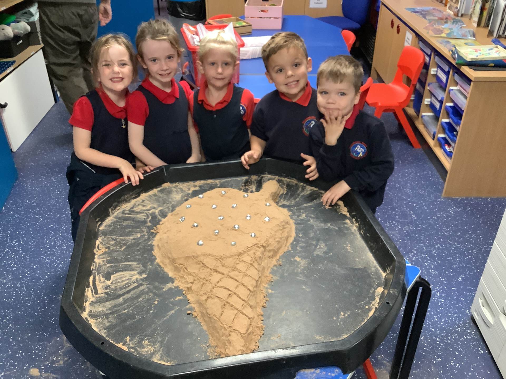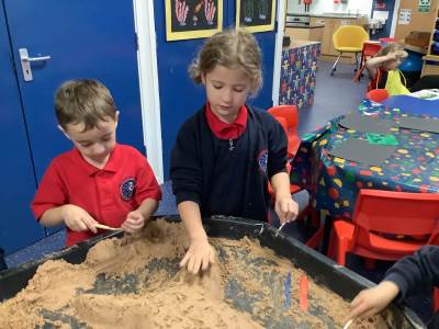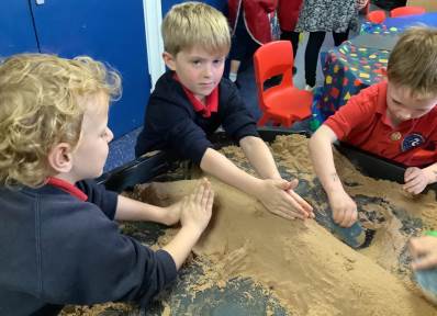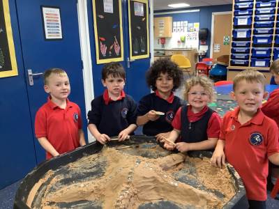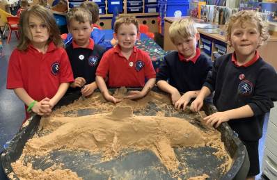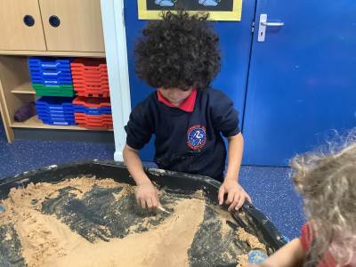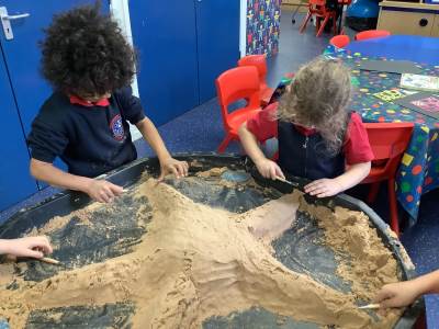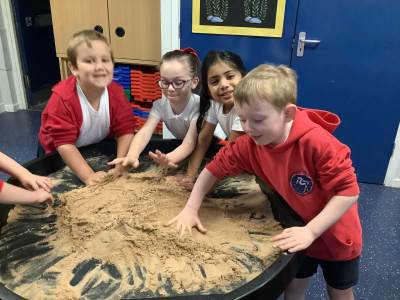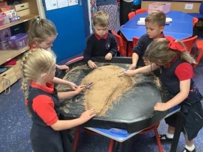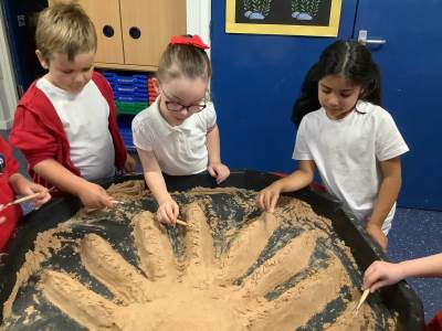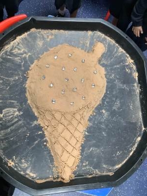 This half term's topic is 'Hooray, Let's Go On Holiday.' As part of our art focus, the children have been learning about sand artists and how they can create amazingly creative sand structures using a range of different tools. We wanted to have a go at creating our own and enjoyed experimenting with the tools to see what effects we could create. We also enjoyed adding our own decorations. Here we are at work.