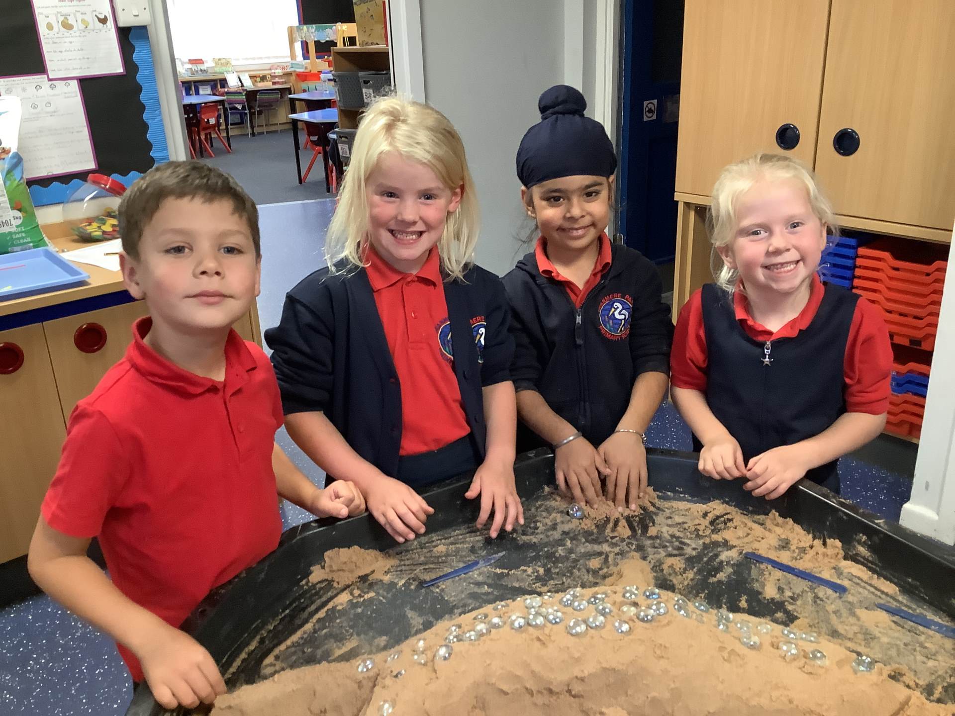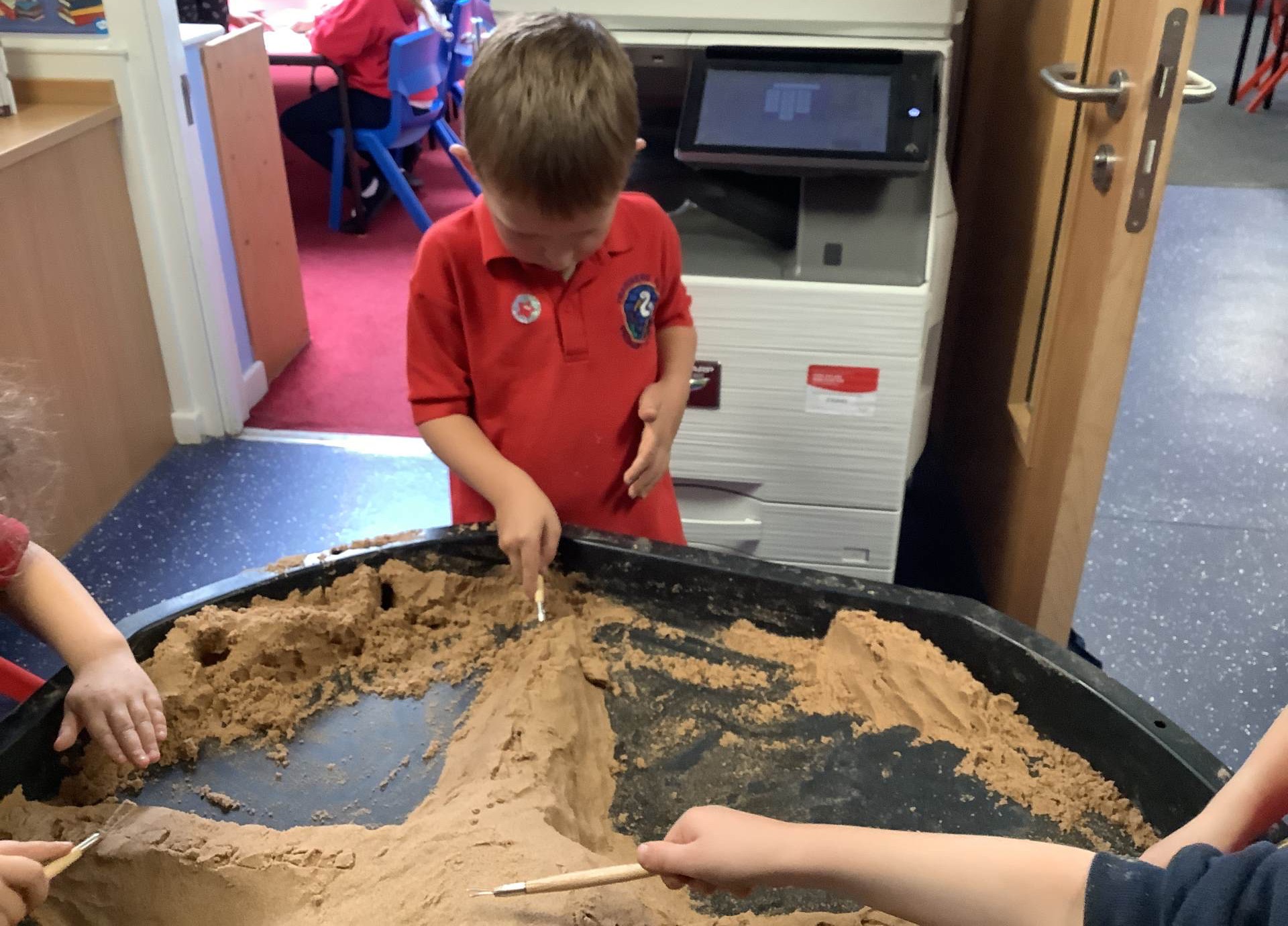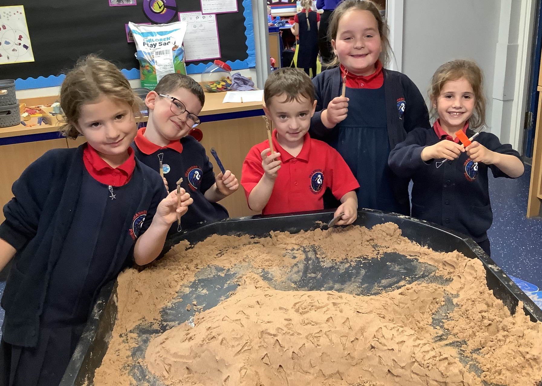 This half term's topic is 'Hooray, Let's Go On Holiday.' As part of our art focus, the children have been learning about sand artists and how they can create amazingly creative sand structures using a range of different tools. We wanted to have a go at creating our own and enjoyed experimenting with the tools to see what effects we could create. We also enjoyed adding our own decorations. Here we are at work.