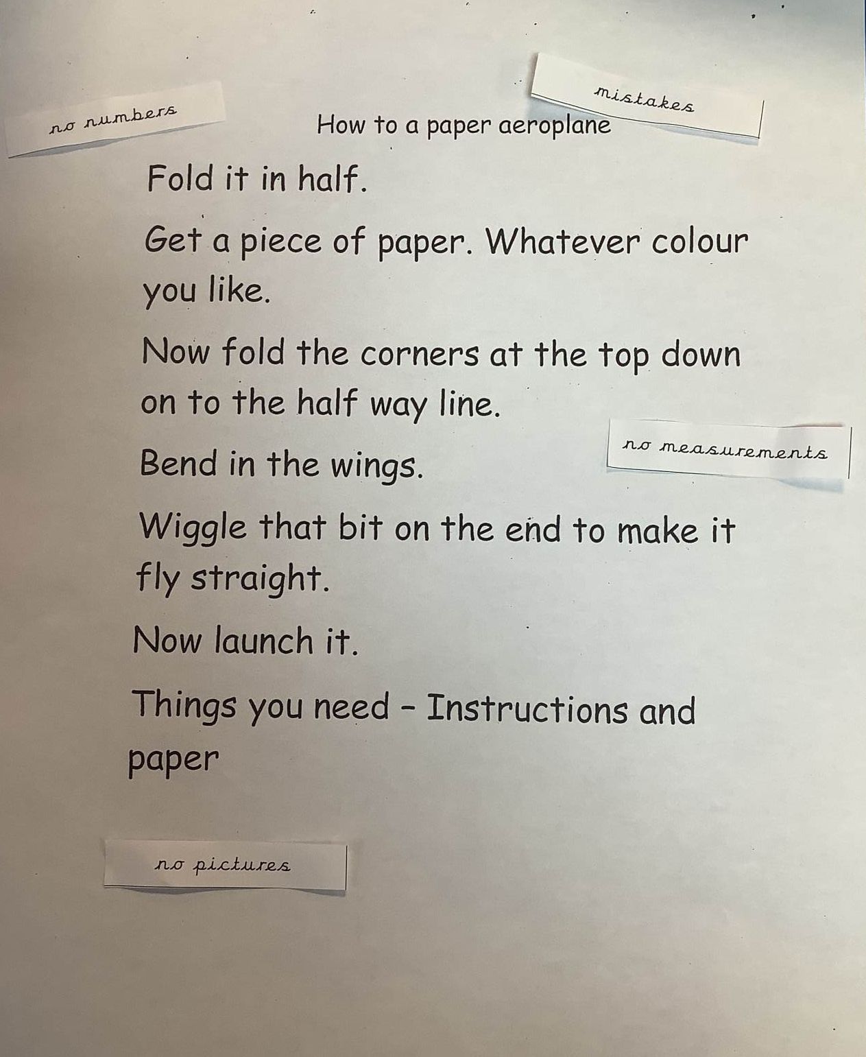 Finally, we looked at two sets of instructions and identified what made the milkshake instructions were so much better. Can you see why the paper areoplane instructions are not very good?