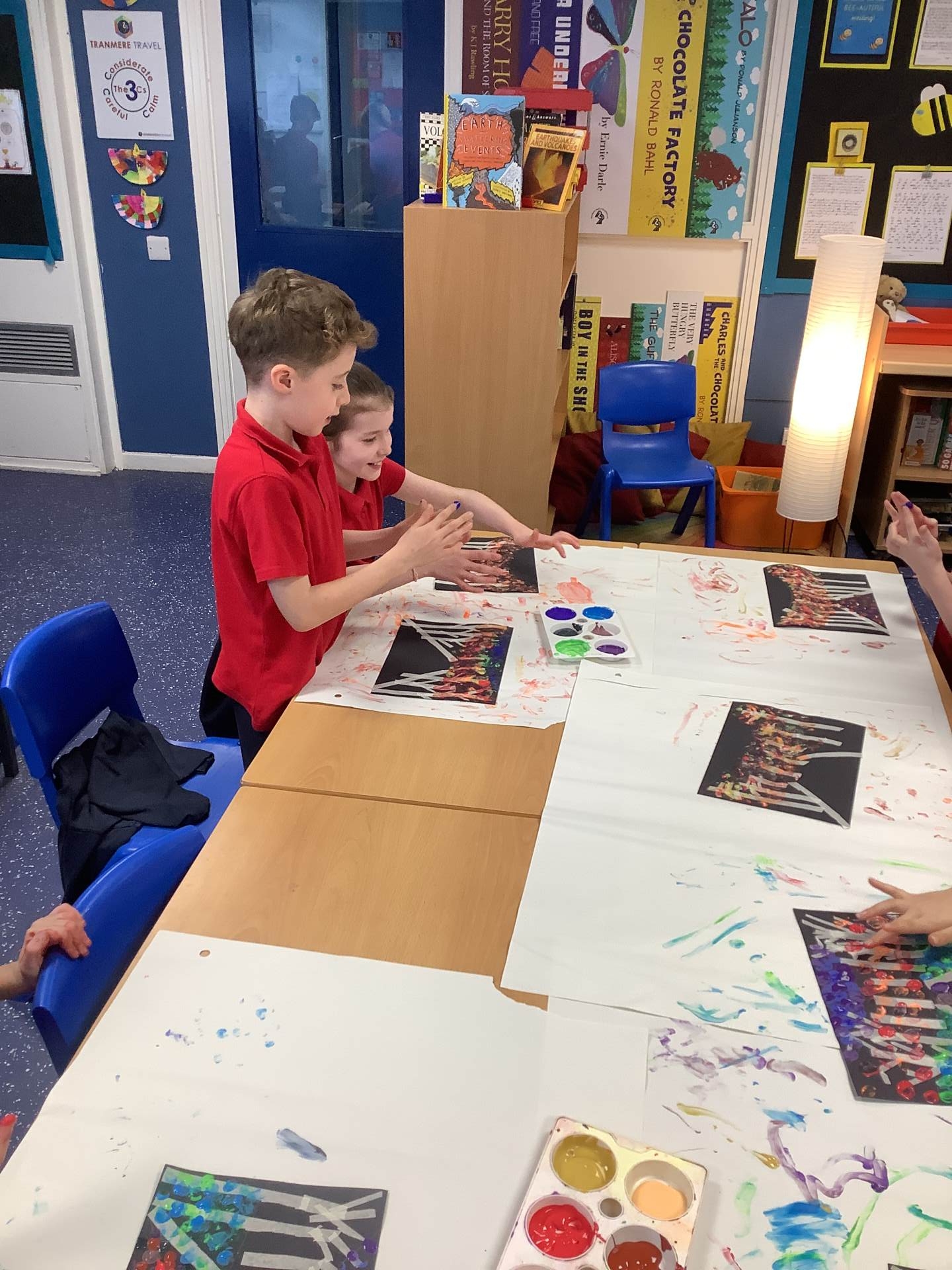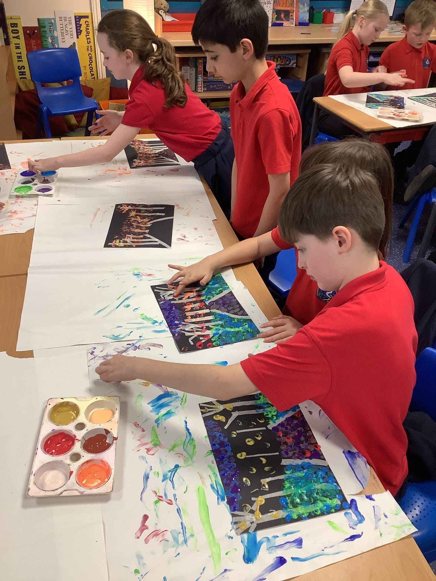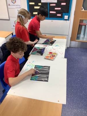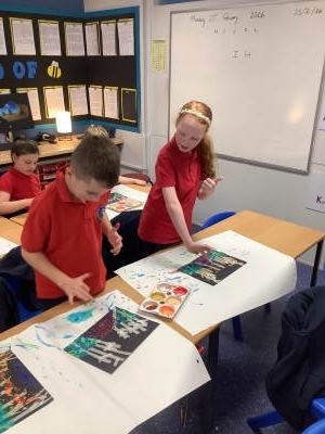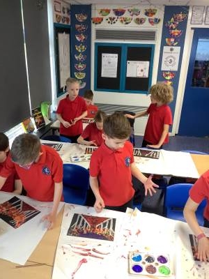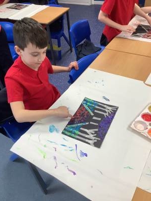 One of the artists we looked at was Leonid Afremov and we loved the colours that he used in his paintings. We decided to have a go and re-create one of his most famous paintings. To do this, we used black card and masking tape to create the background. We then used the paints to mix together the colours. After this, we took the masking tape off and created our finished piece. Have a look at our process - we can't wait to show you our finished creations!