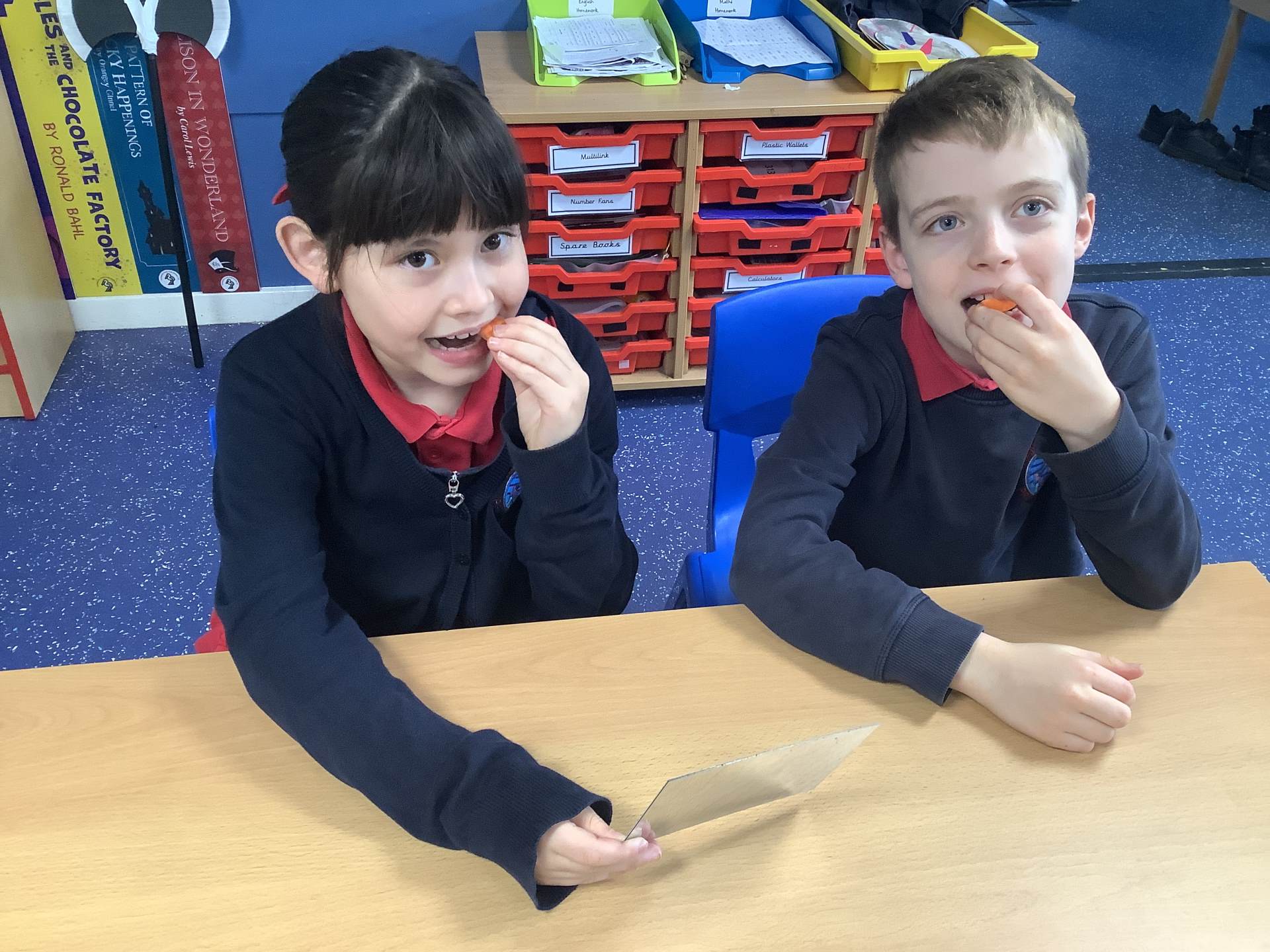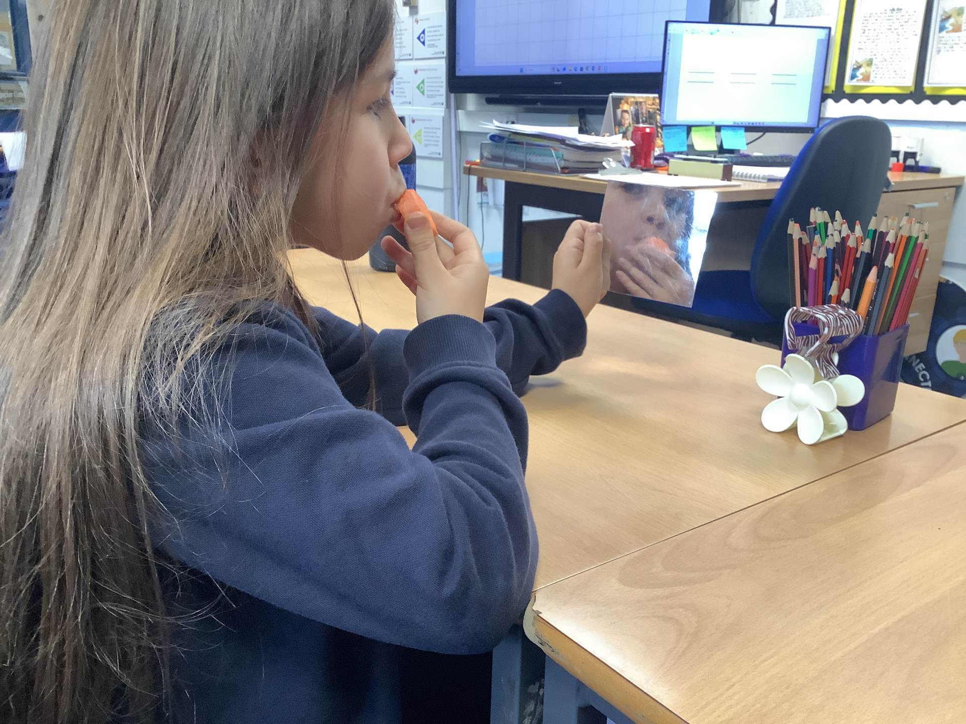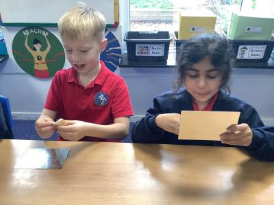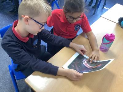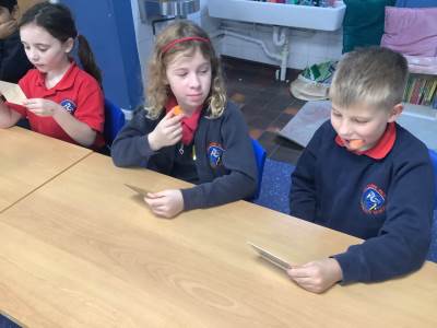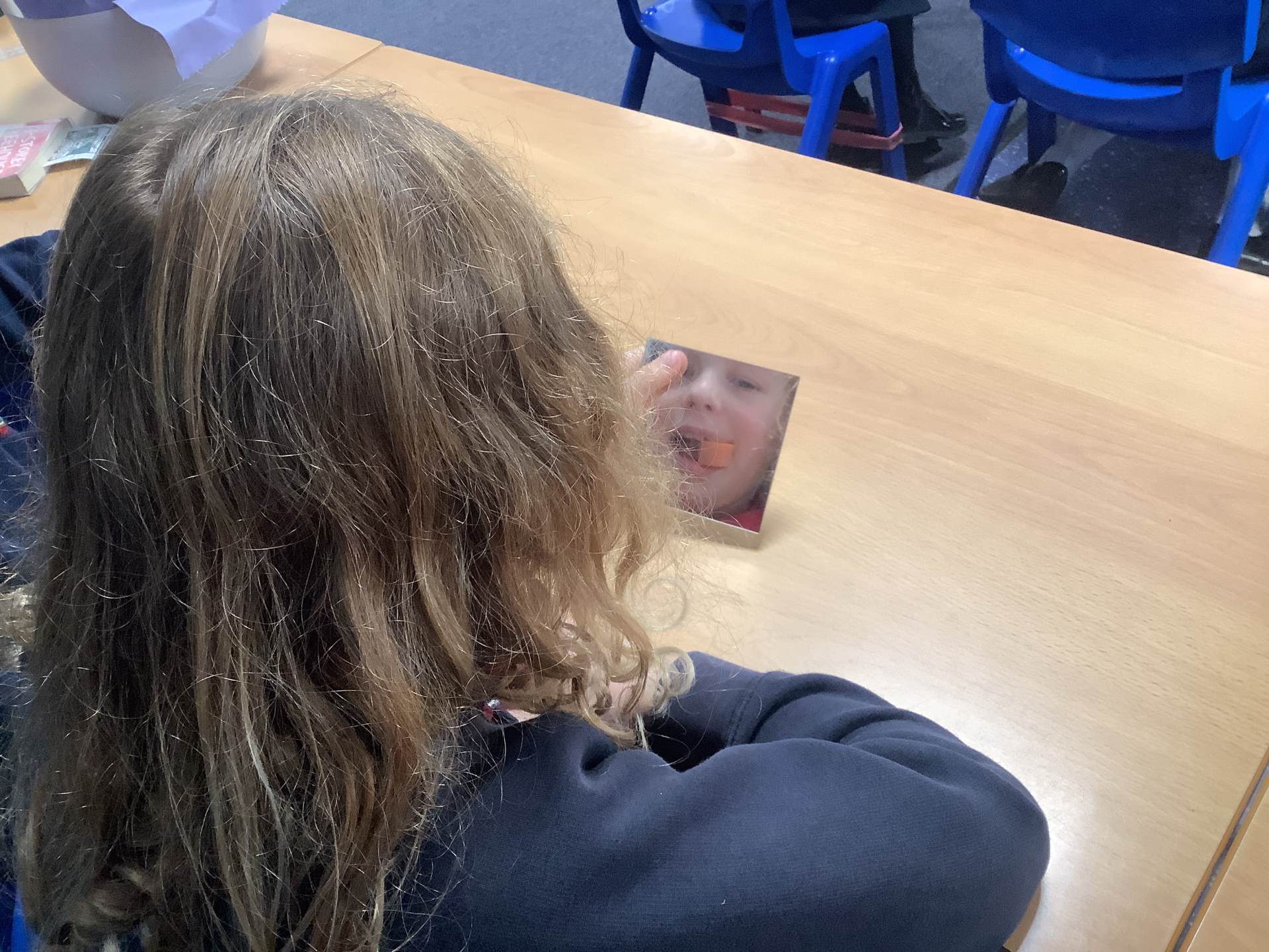Today, the children looked at the four types of teeth; incisors, canines, molars and premolars. They spent time looking in mirrors to identify these teeth and how they use them to chew different foods. They also looked at different animals’ teeth and why they were different depending on their diet.
