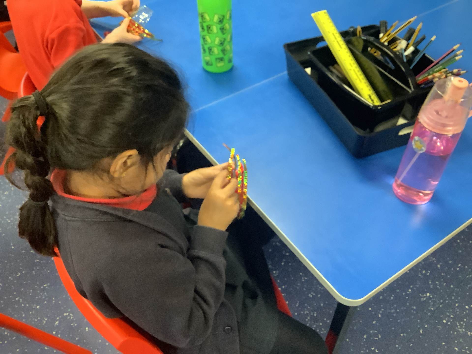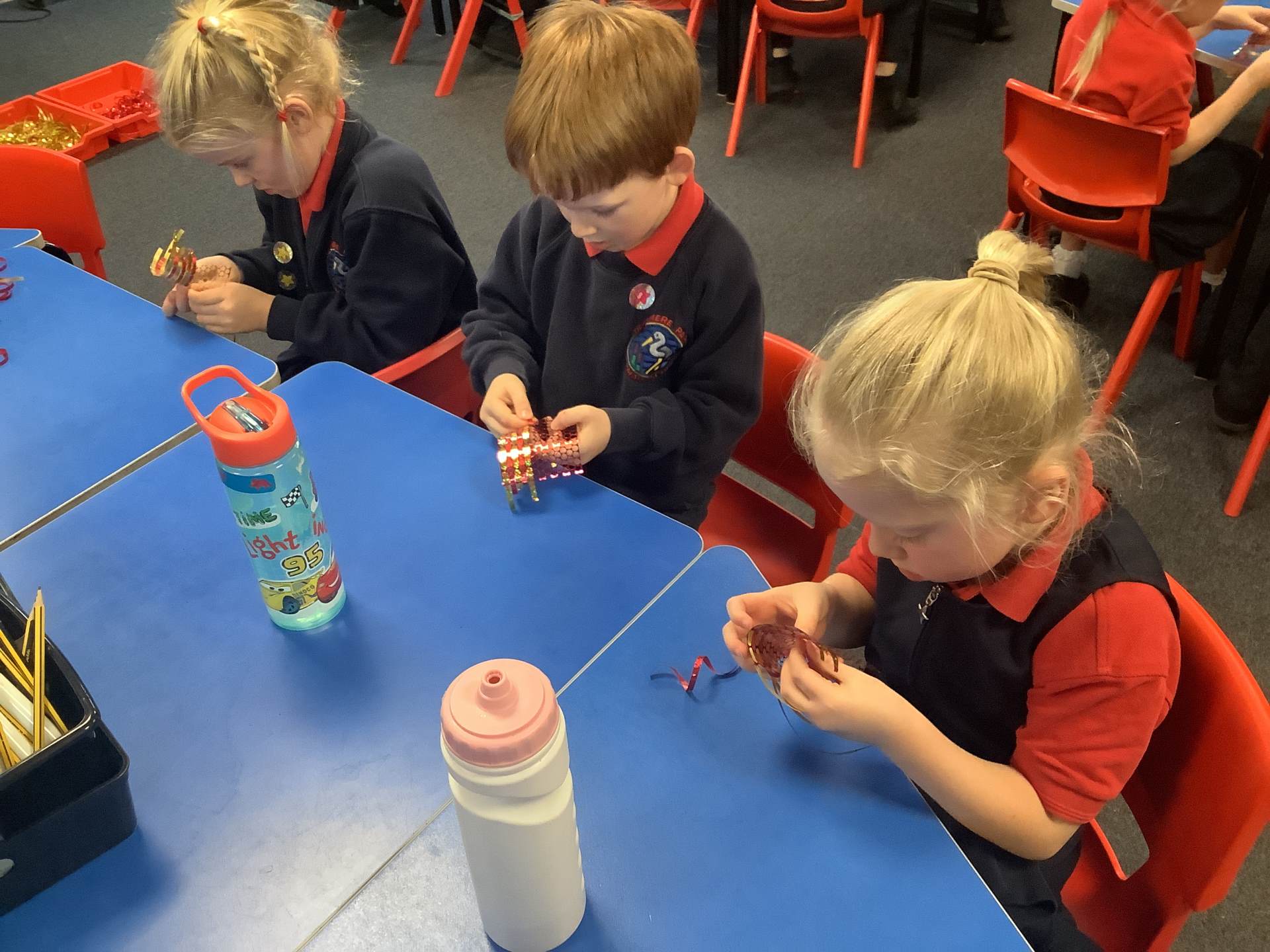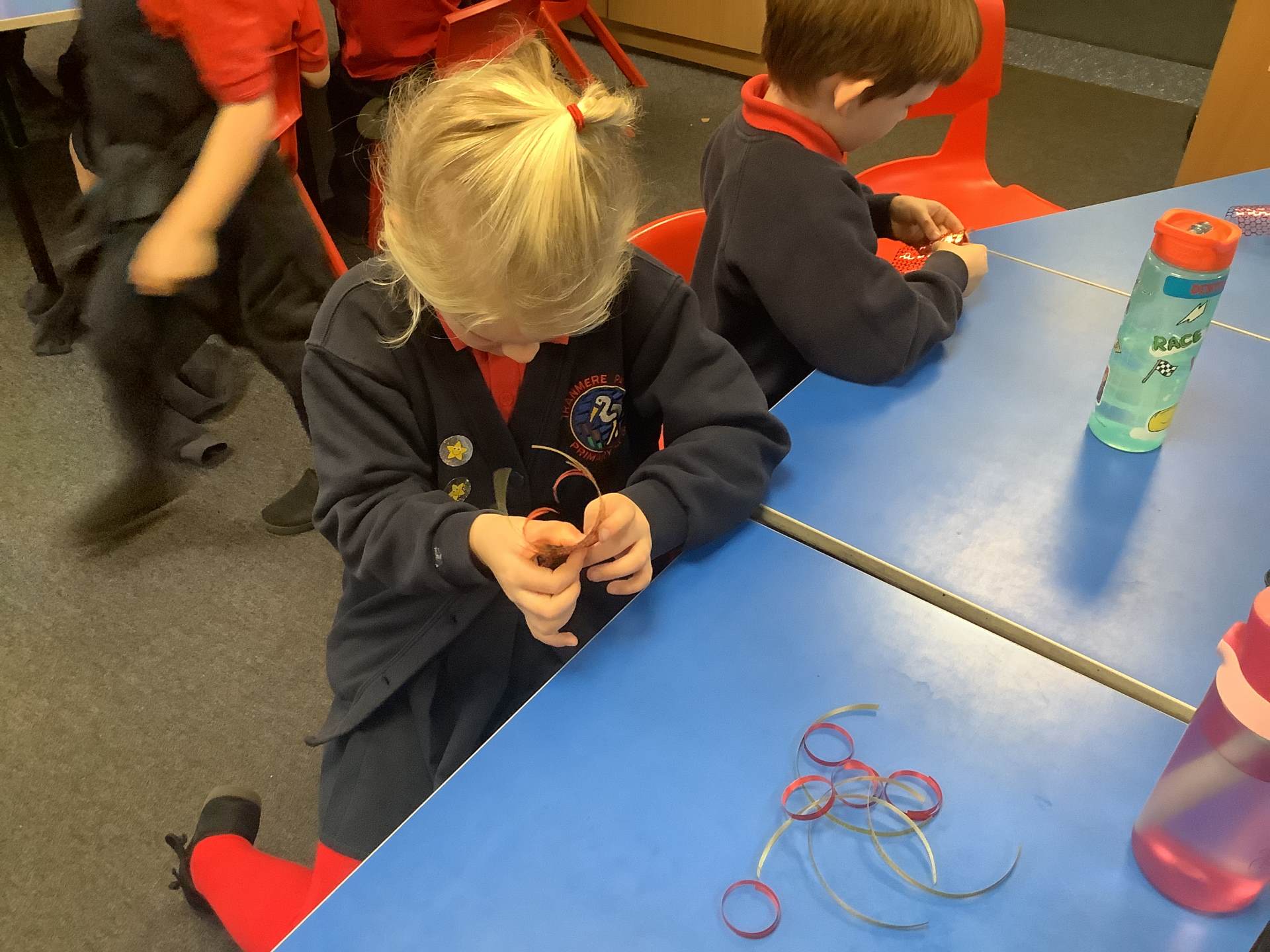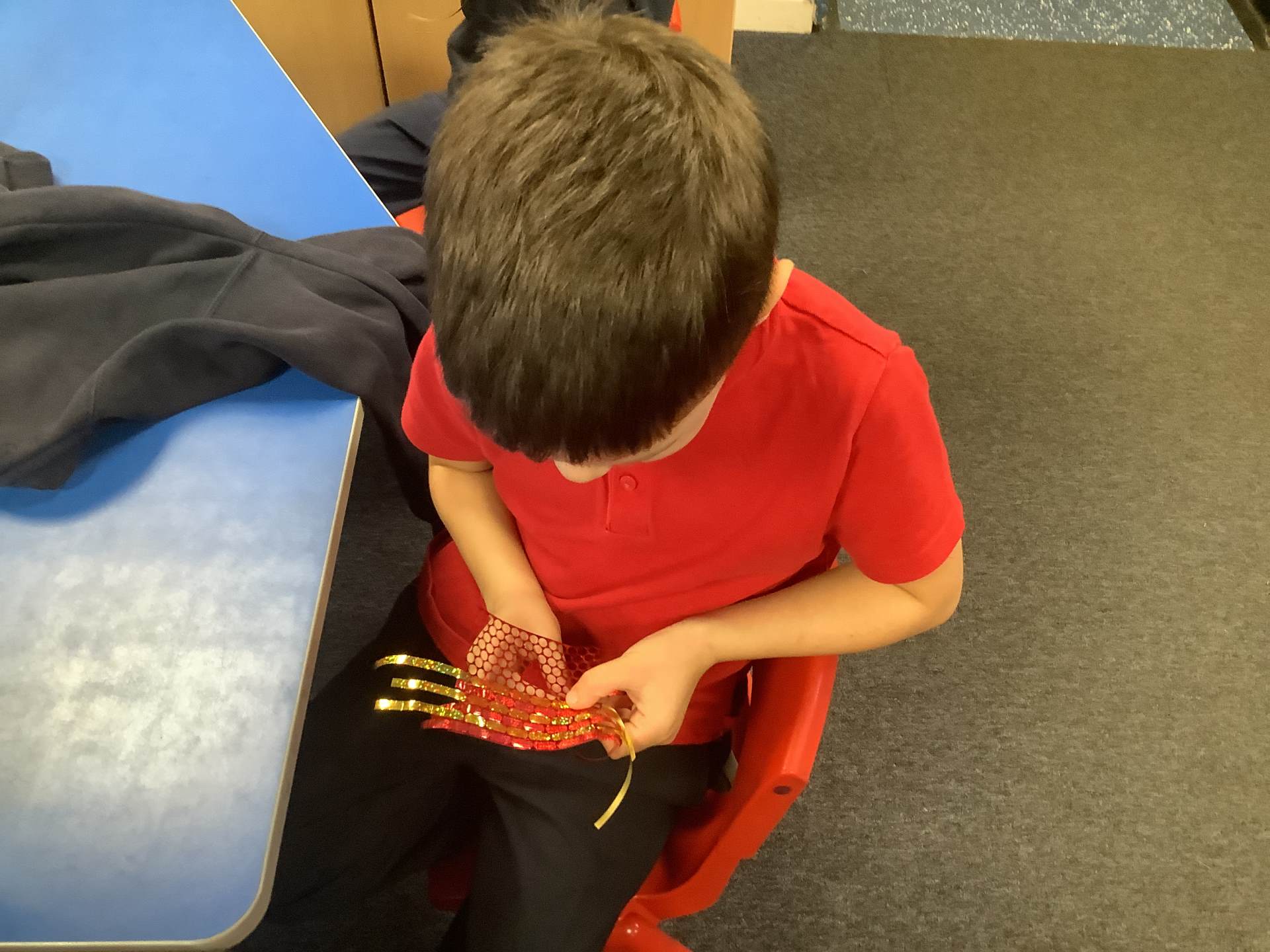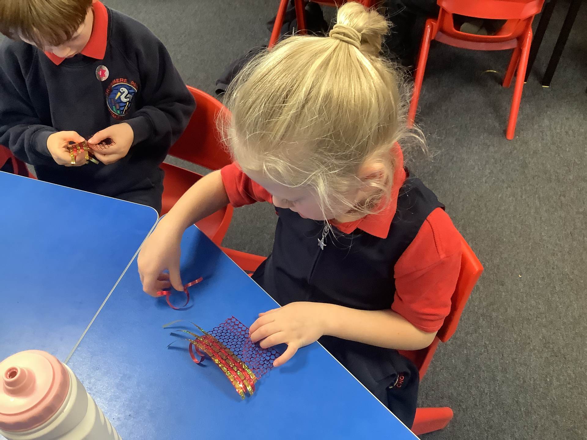 We used smaller pieces of foil ribbon and threaded alternate colours through the punchenella to create a pattern. Look at the concentration on our faces!
