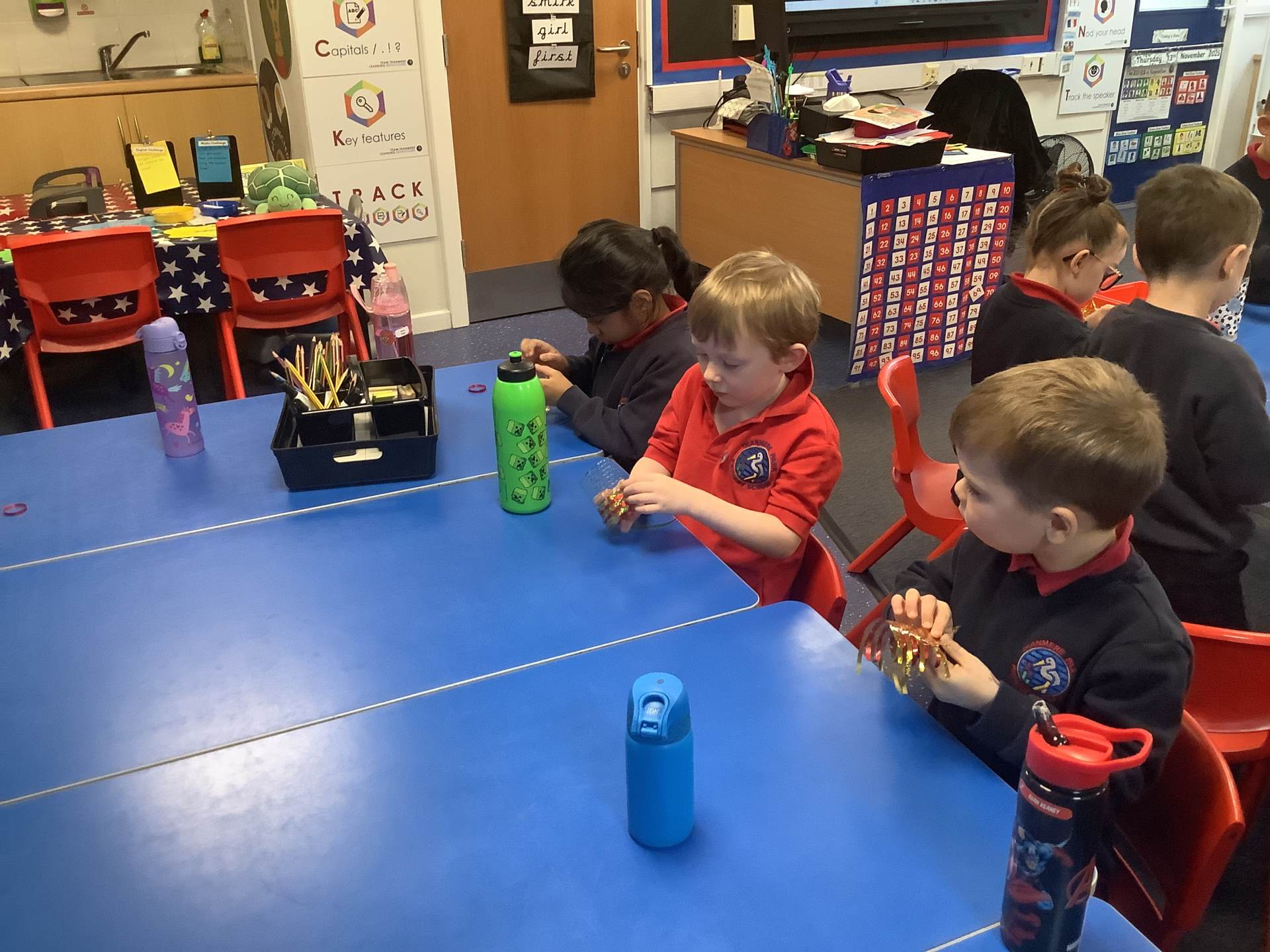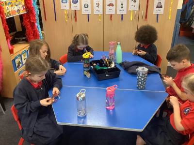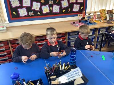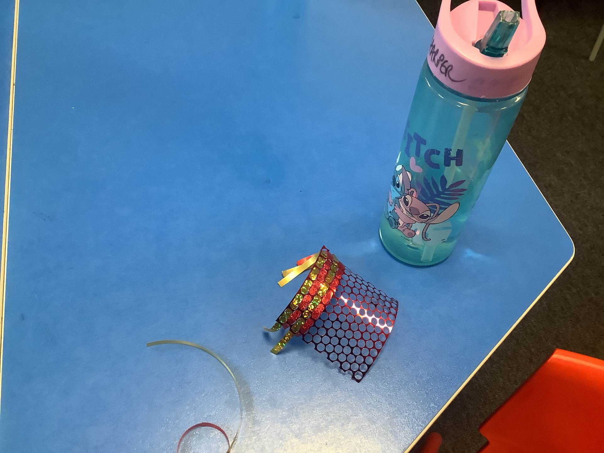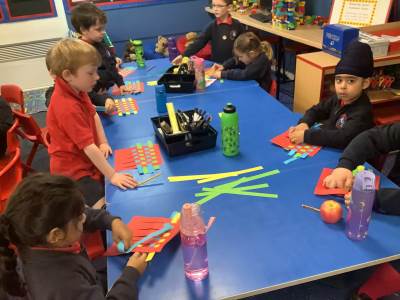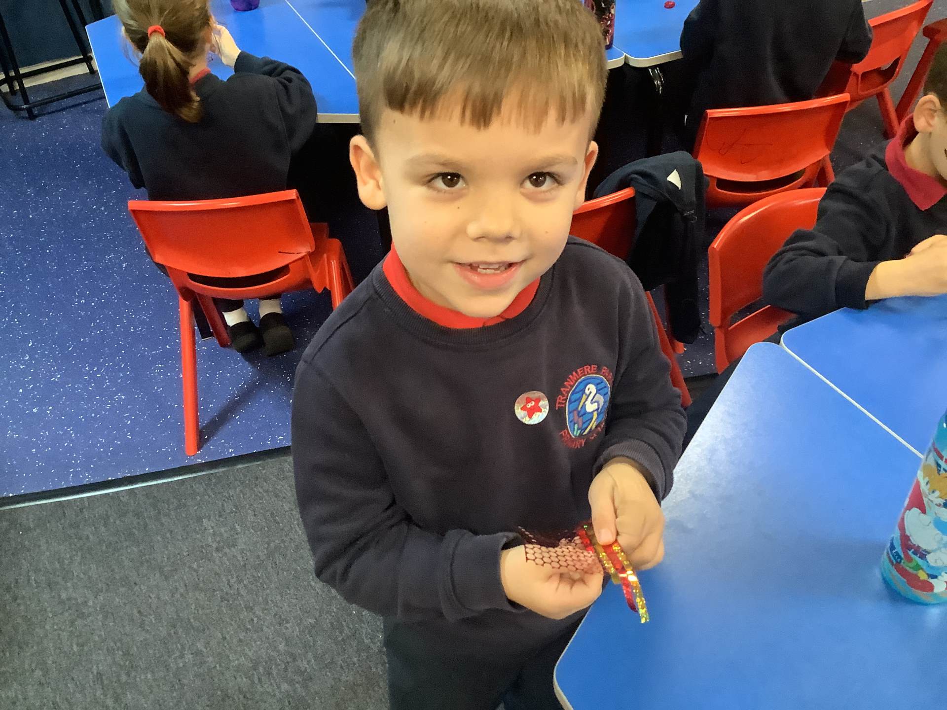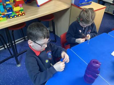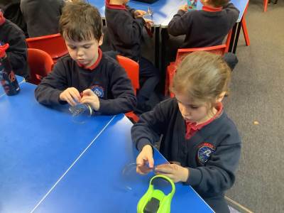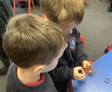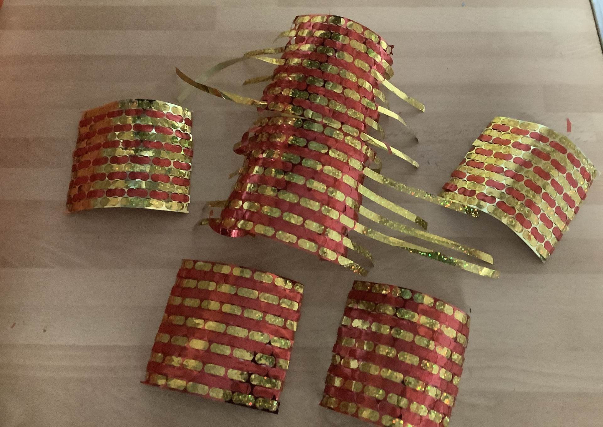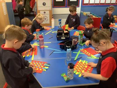 We used smaller pieces of foil ribbon and threaded alternate colours through the punchenella to create a pattern. Look at the concentration on our faces!