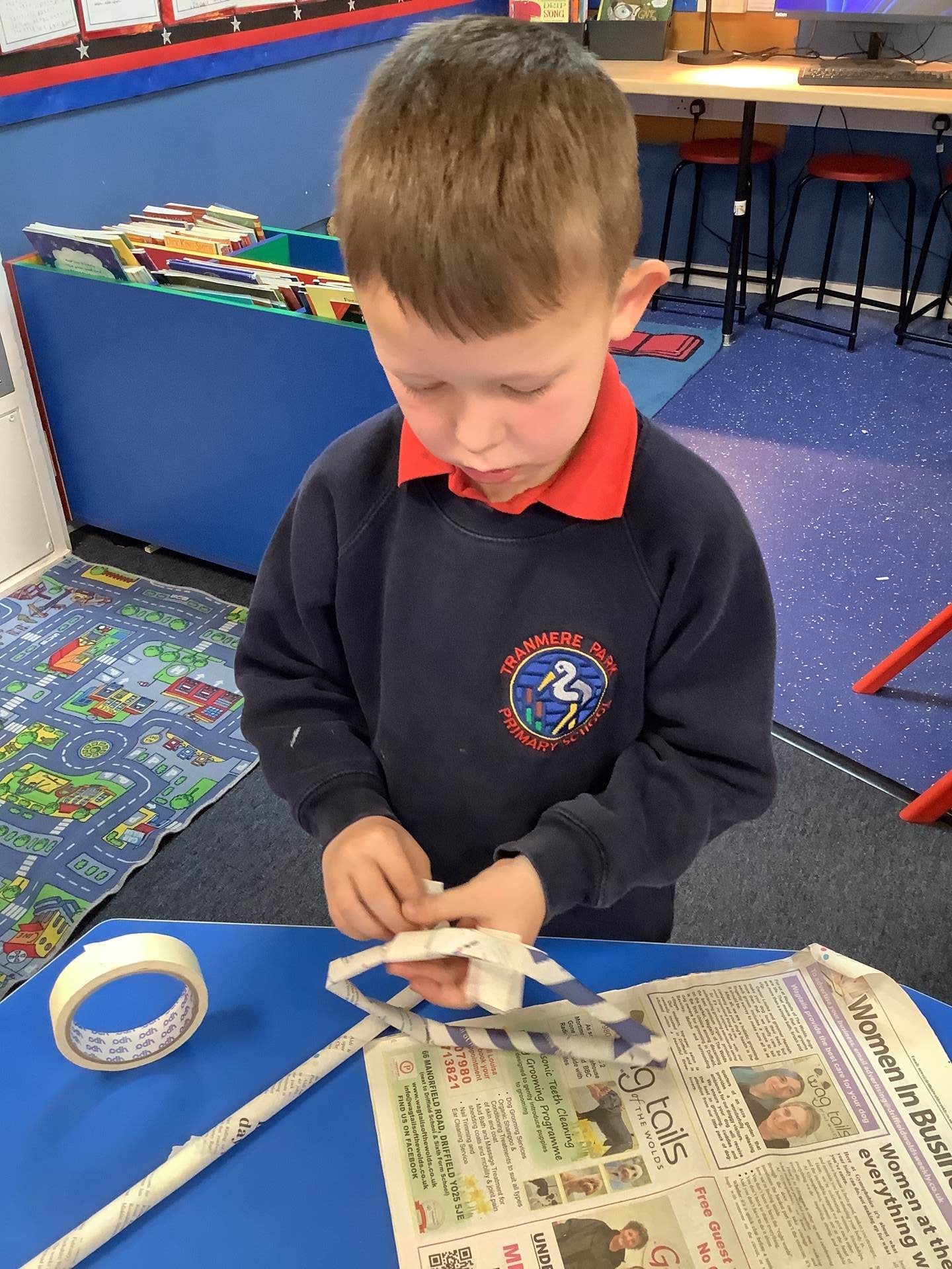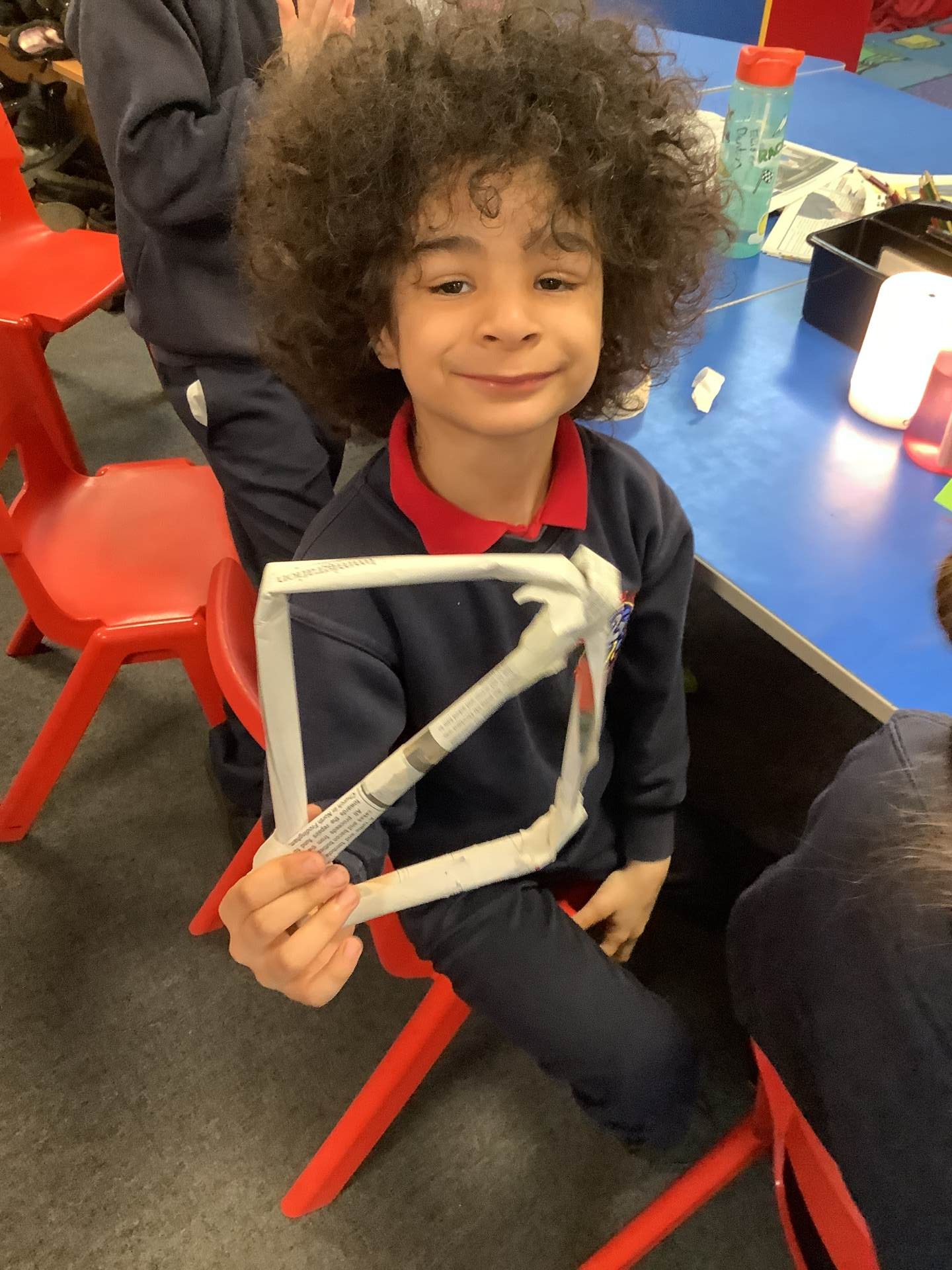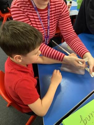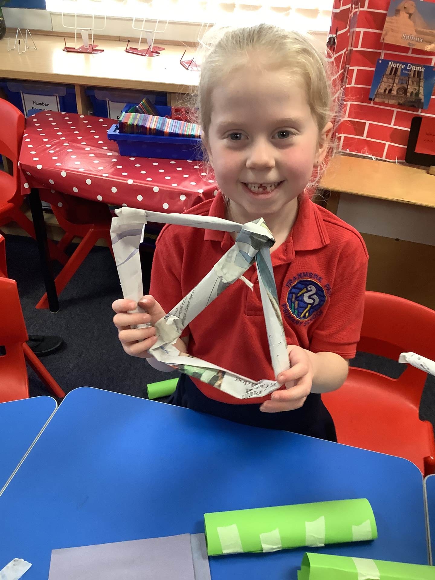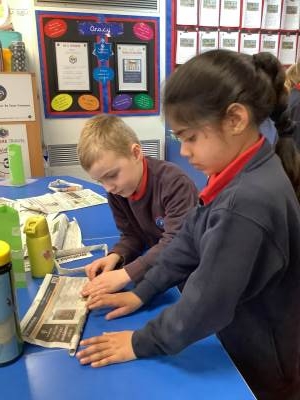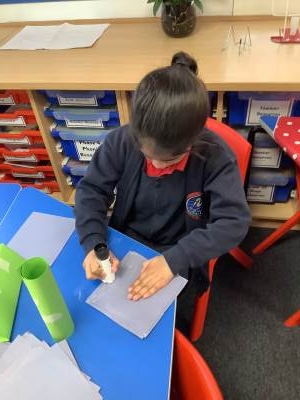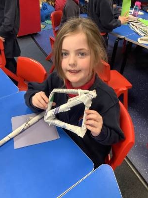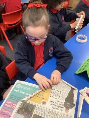 Today, the children practised laminating (layering sheets of paper/card to make it stronger), rolling, shaping (cylinders and triangular prisms are strong shapes) and we also used struts to turn squares into triangles, as triangles are stronger than squares. The children will be utilising these techniques when designing their towers this week.