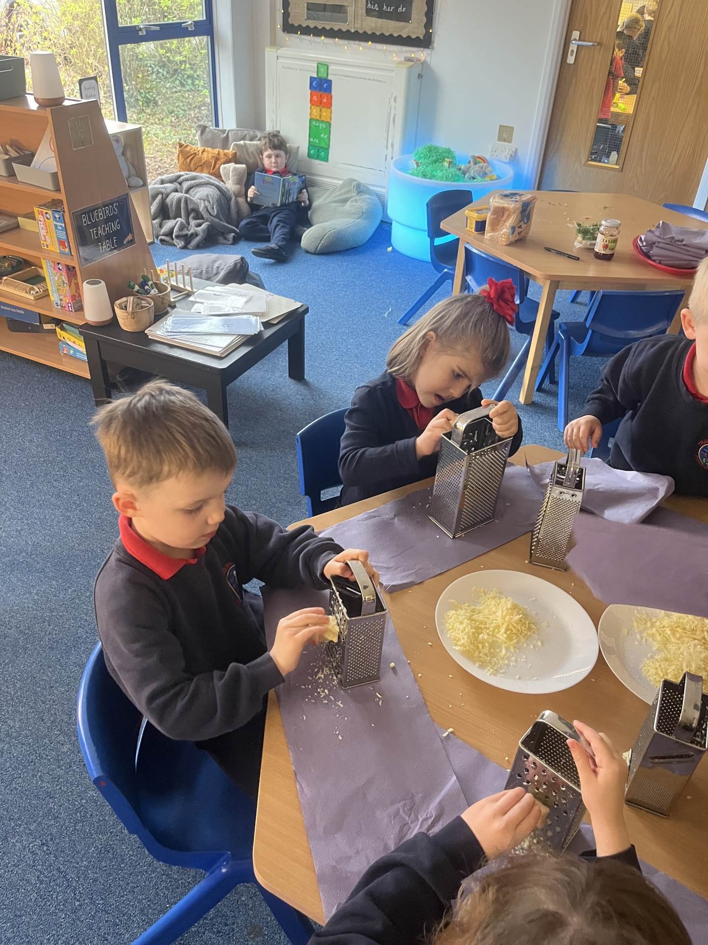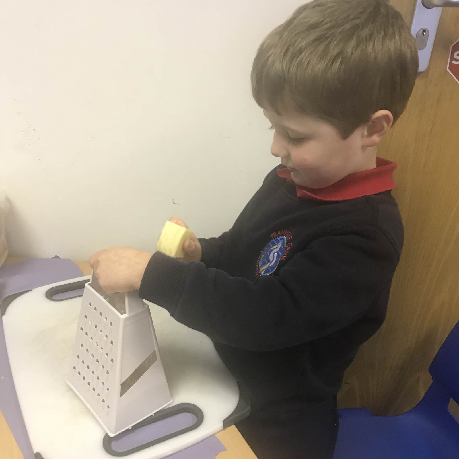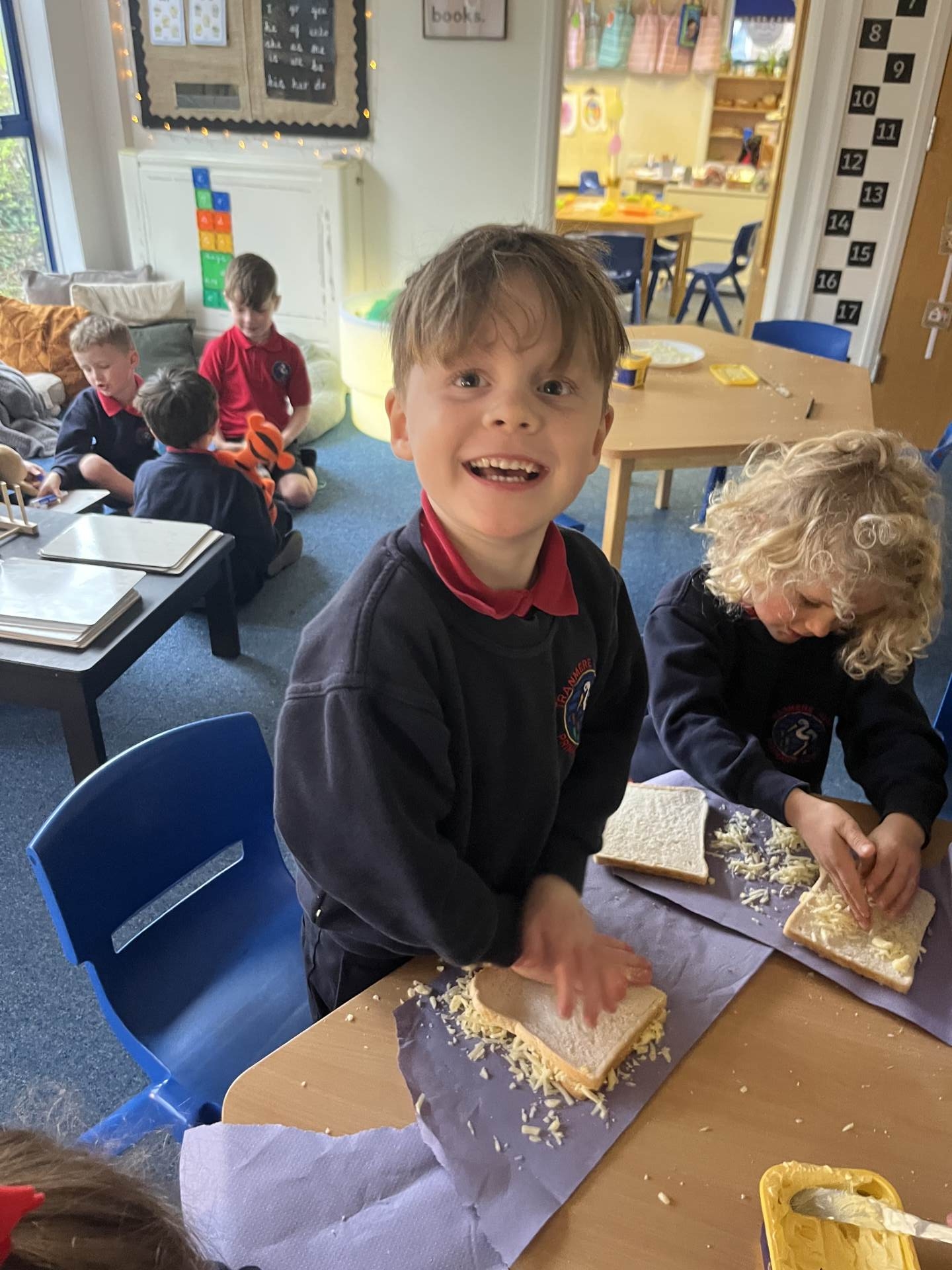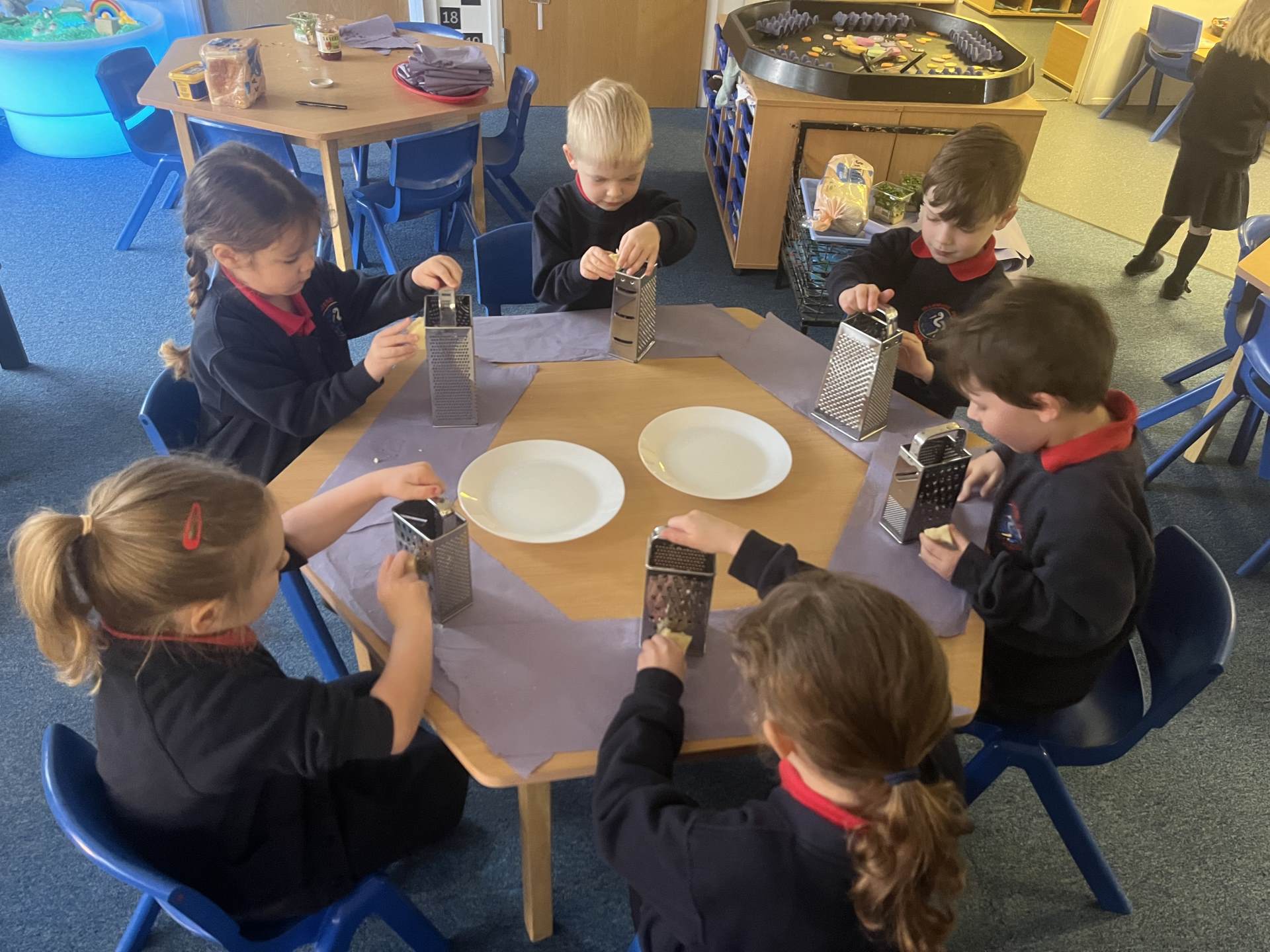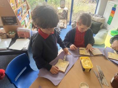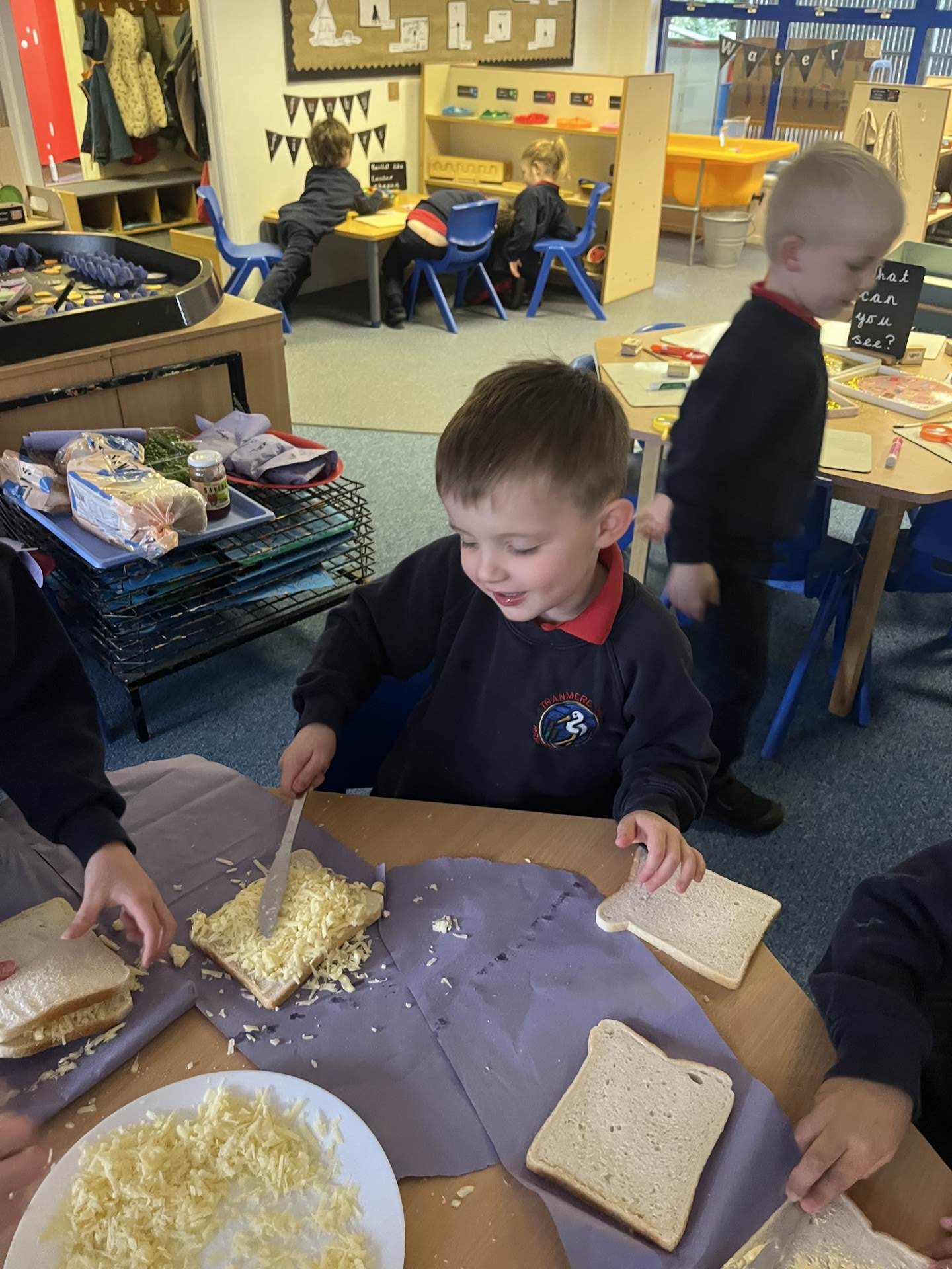 In the morning, the children helped to prepare their own snacks, practising important skills such as spreading, cutting, grating, tearing, sprinkling and making choices about what they would like to eat. This linked closely to our learning about where food comes from and how we prepare it.