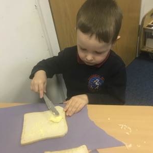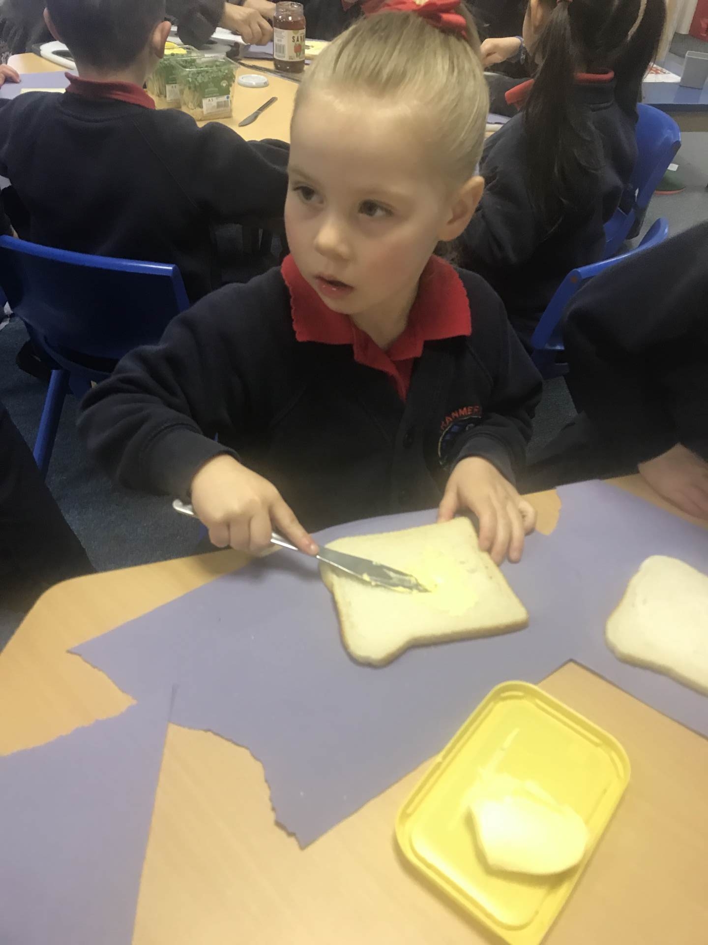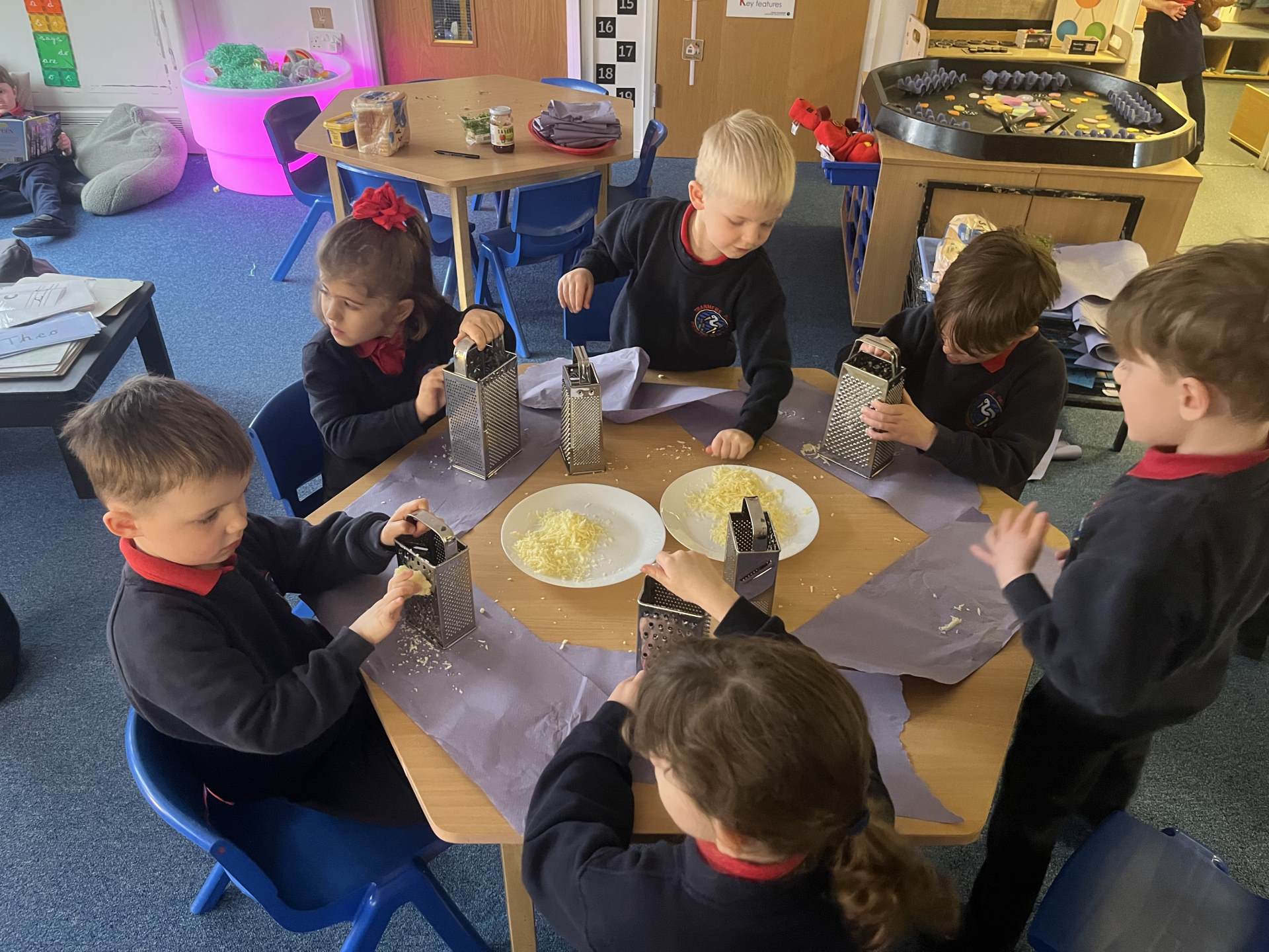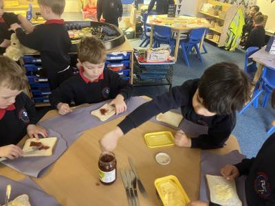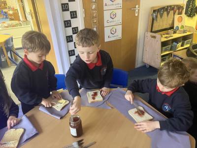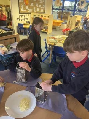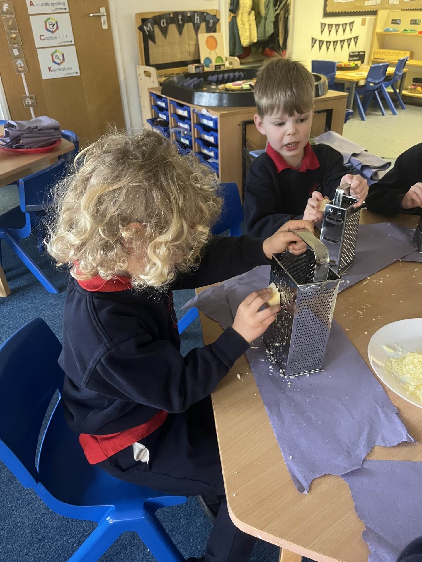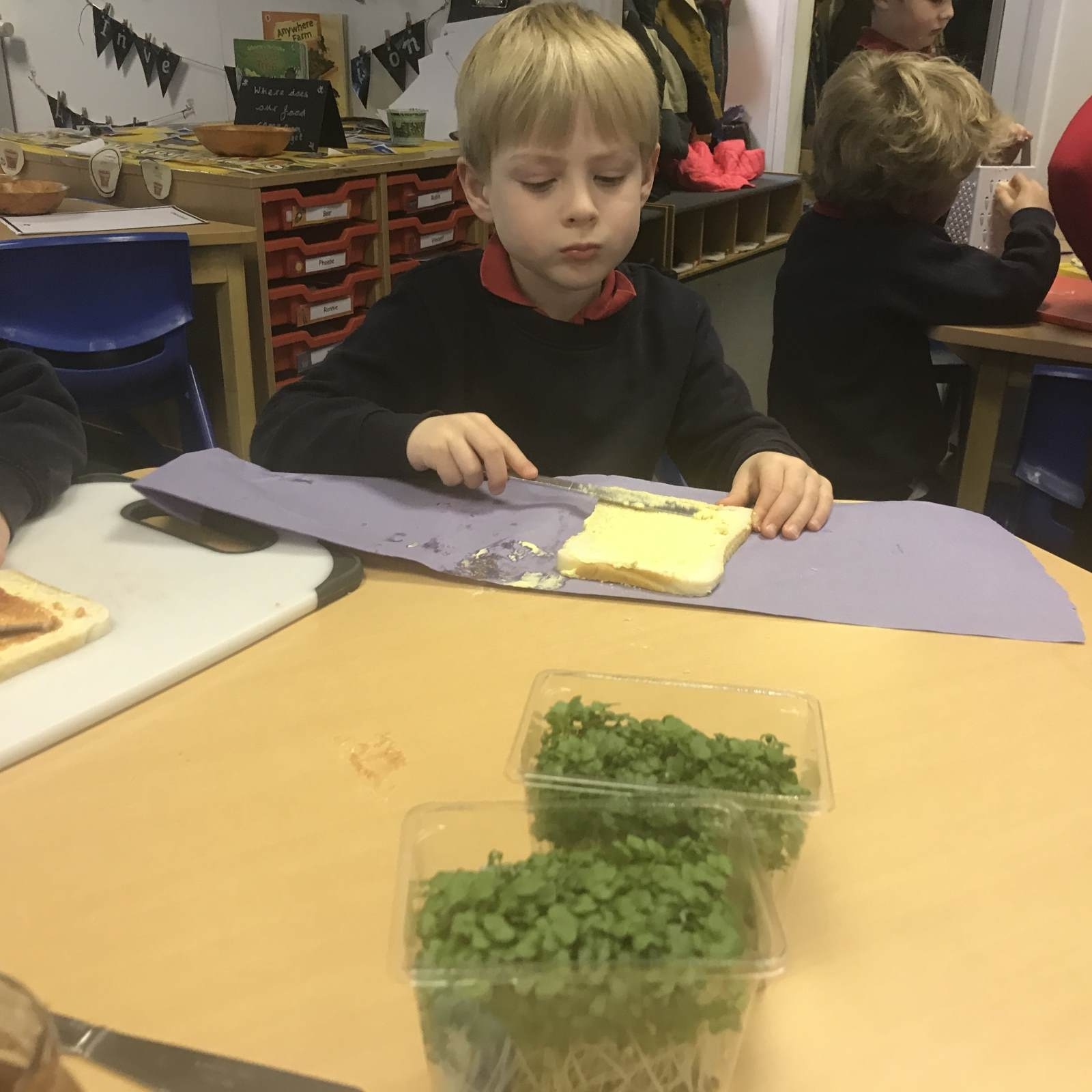 In the morning, the children helped to prepare their own snacks, practising important skills such as spreading, cutting, grating, tearing, sprinkling and making choices about what they would like to eat. This linked closely to our learning about where food comes from and how we prepare it.