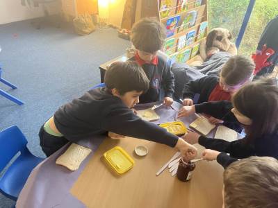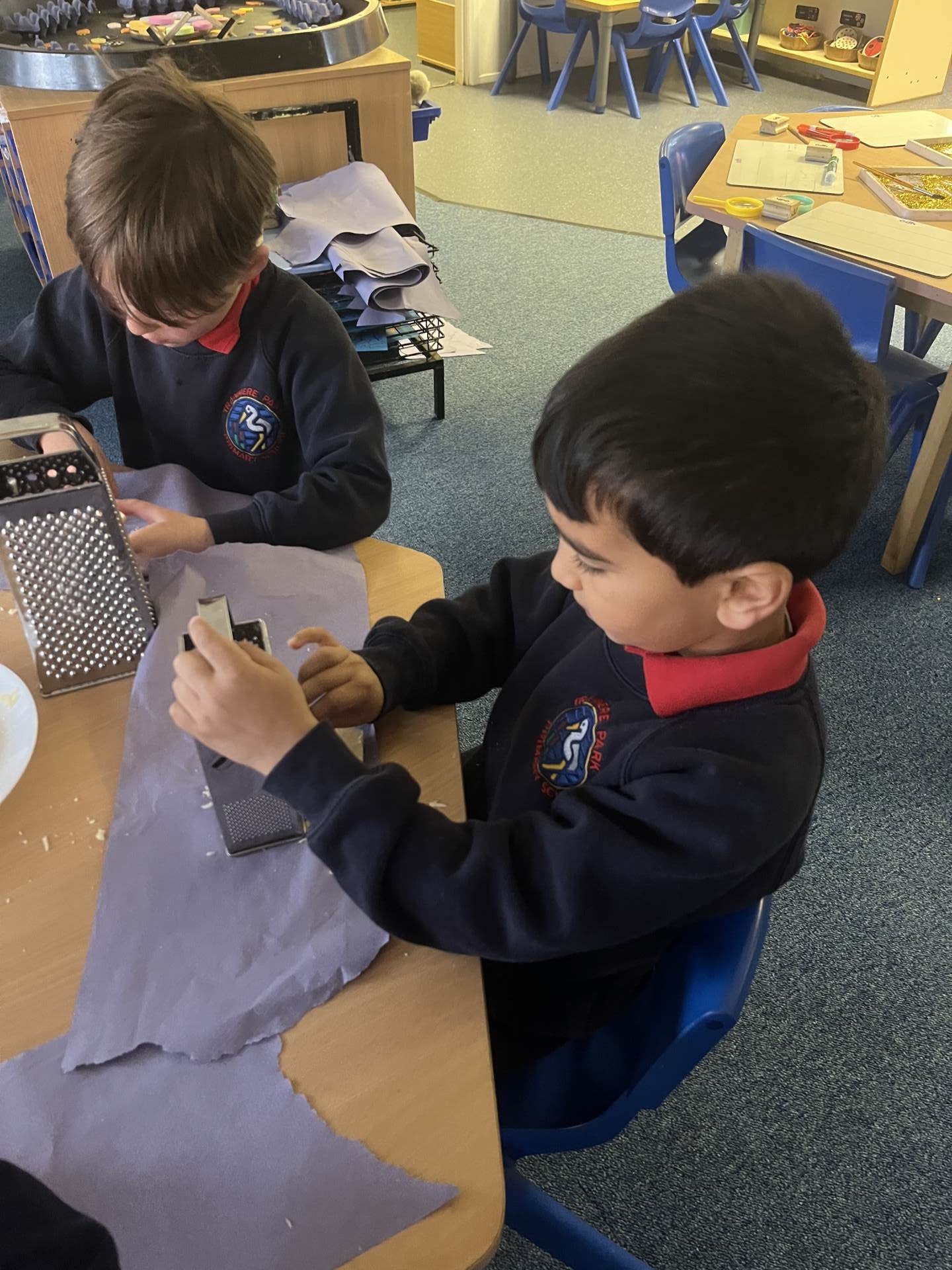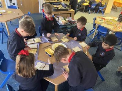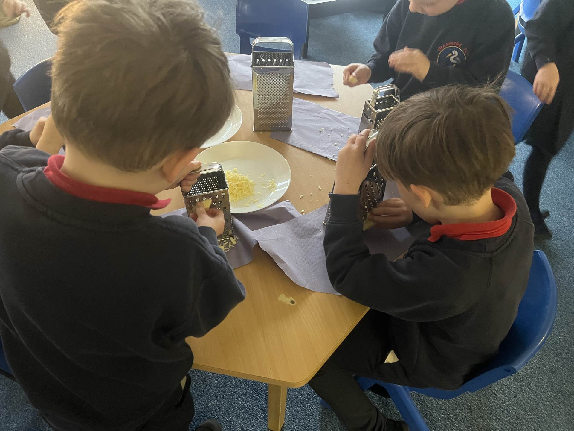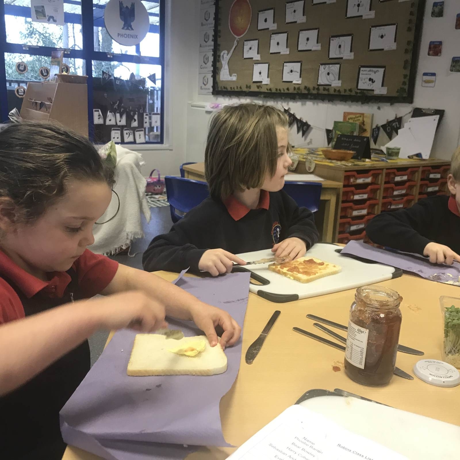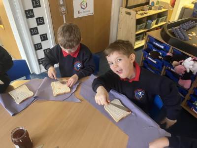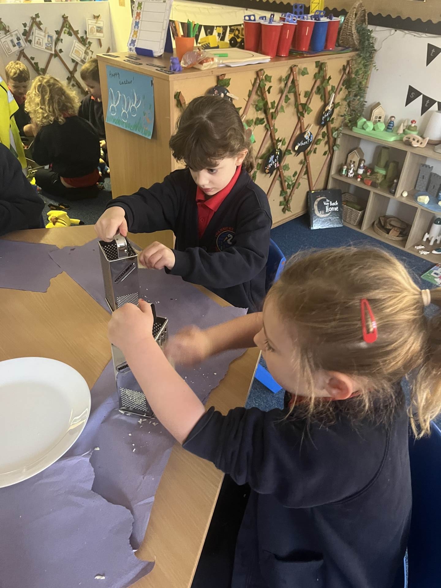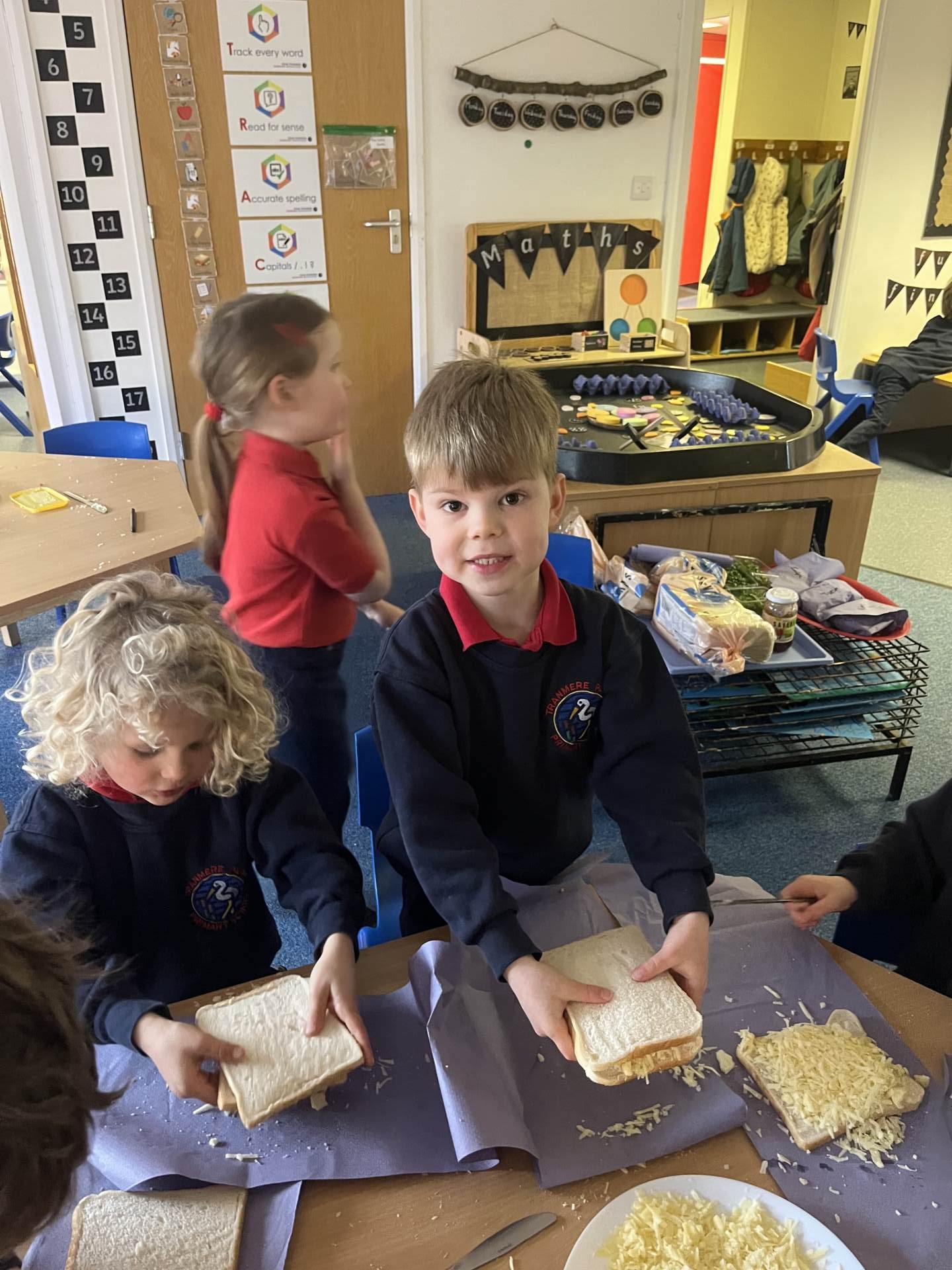 In the morning, the children helped to prepare their own snacks, practising important skills such as spreading, cutting, grating, tearing, sprinkling and making choices about what they would like to eat. This linked closely to our learning about where food comes from and how we prepare it.