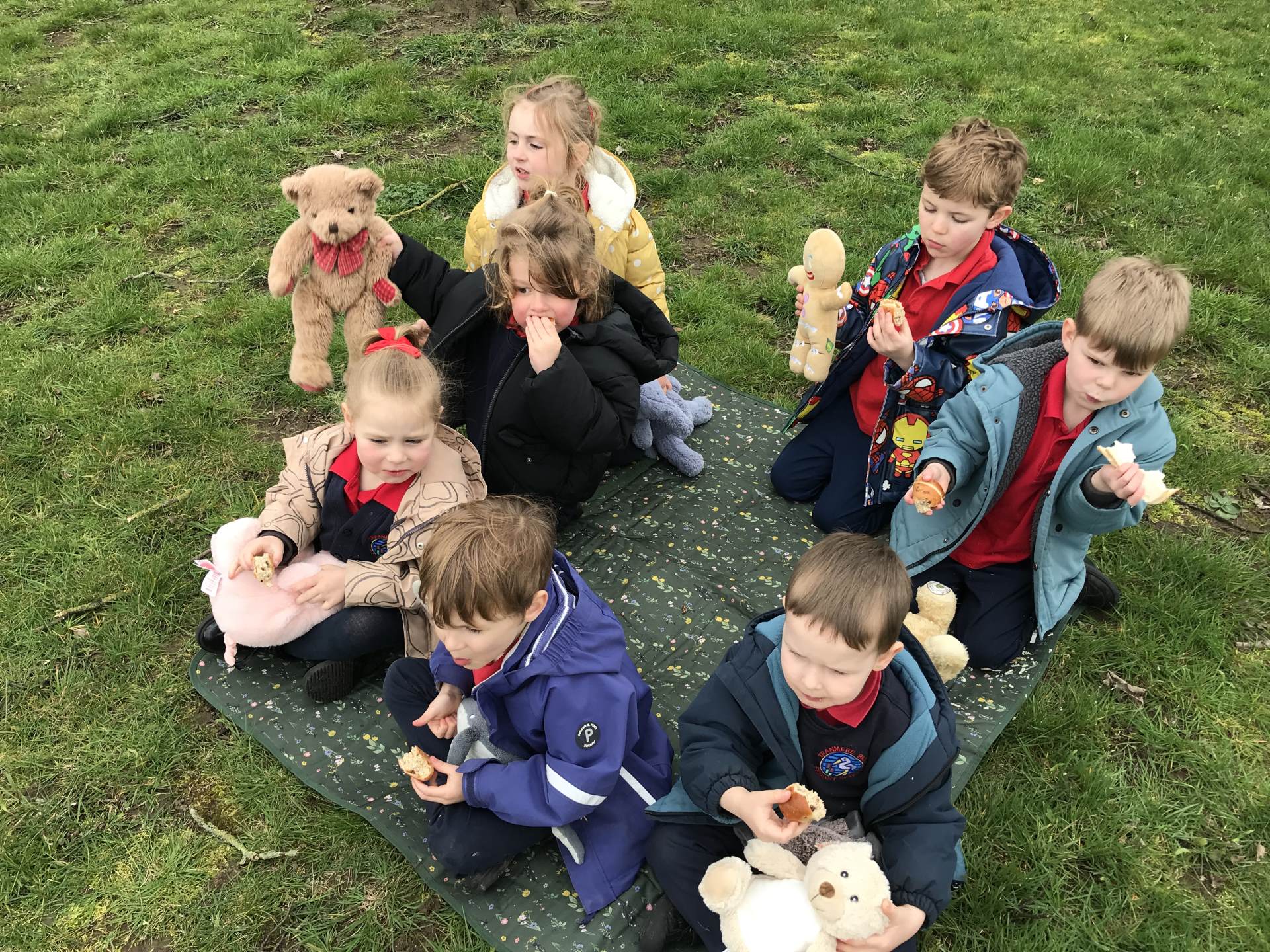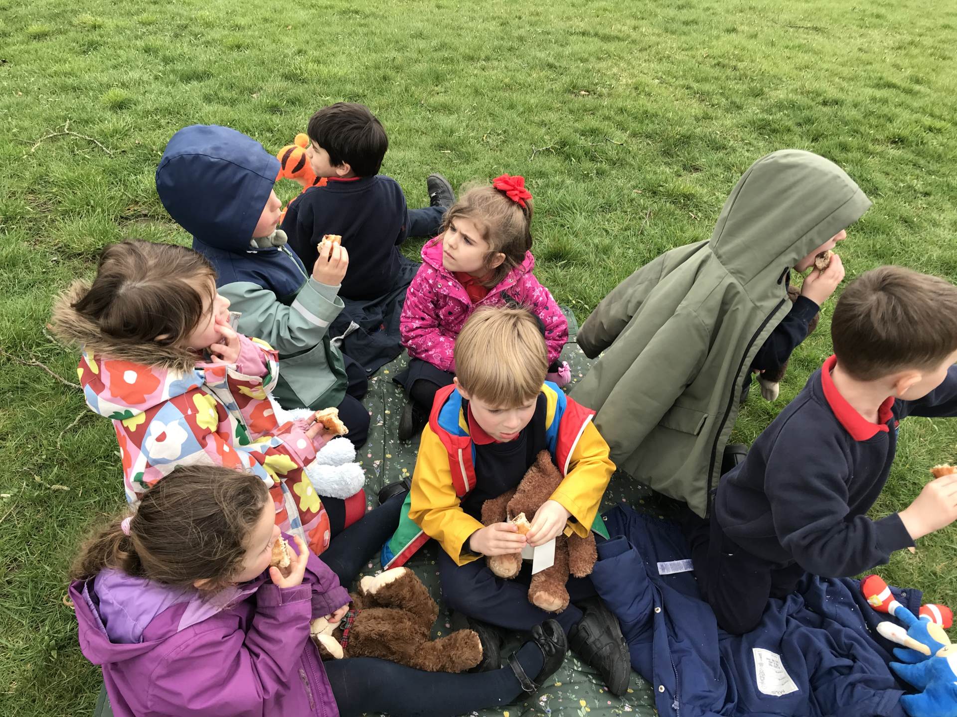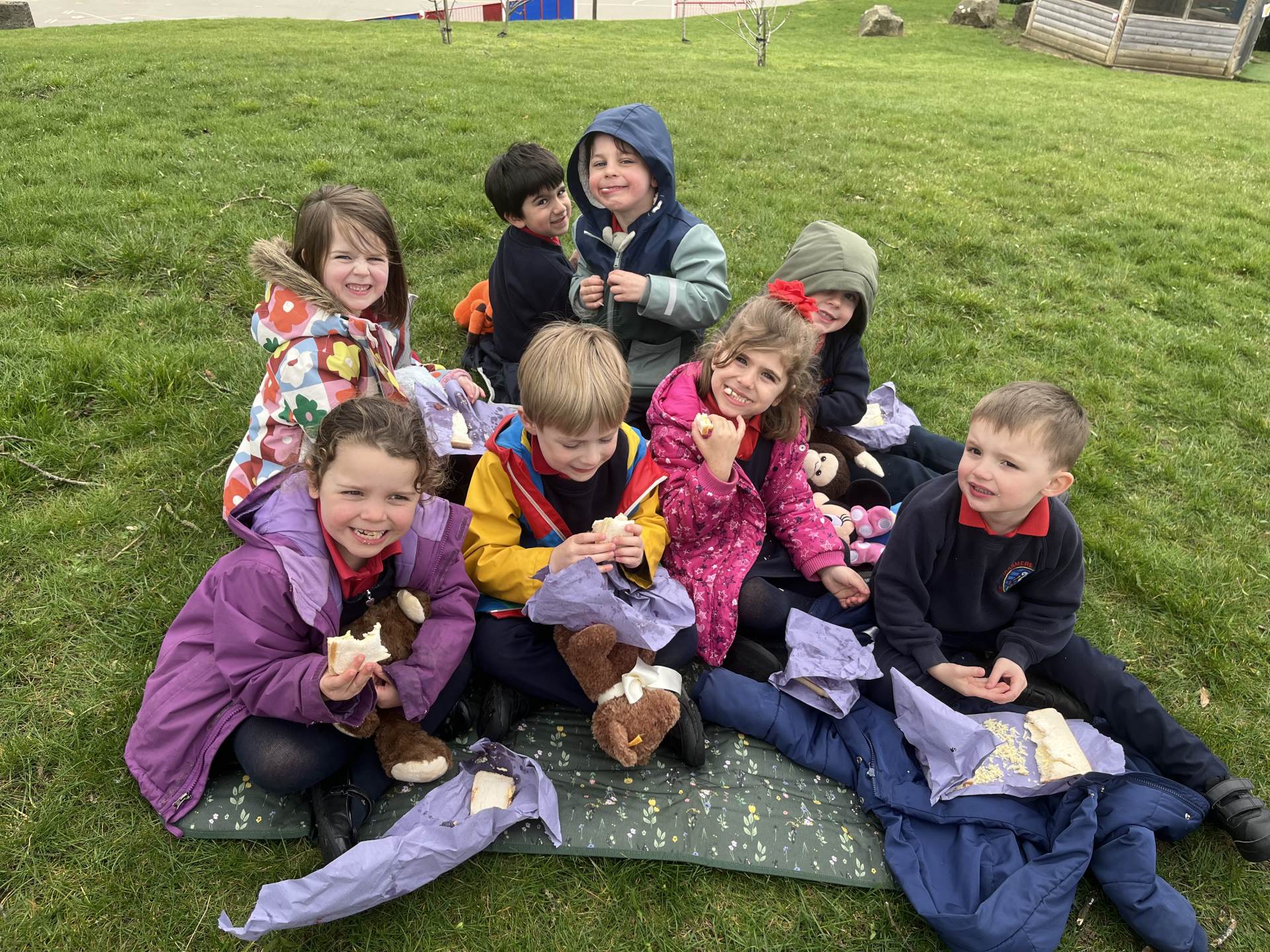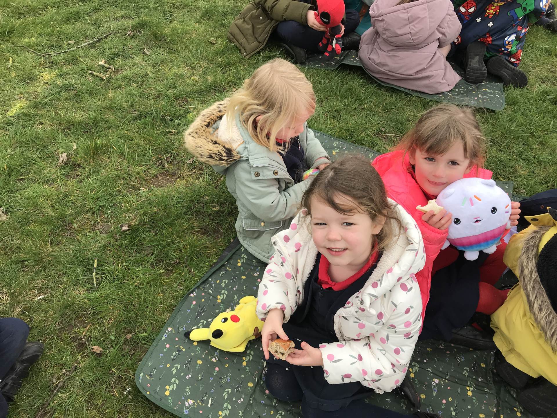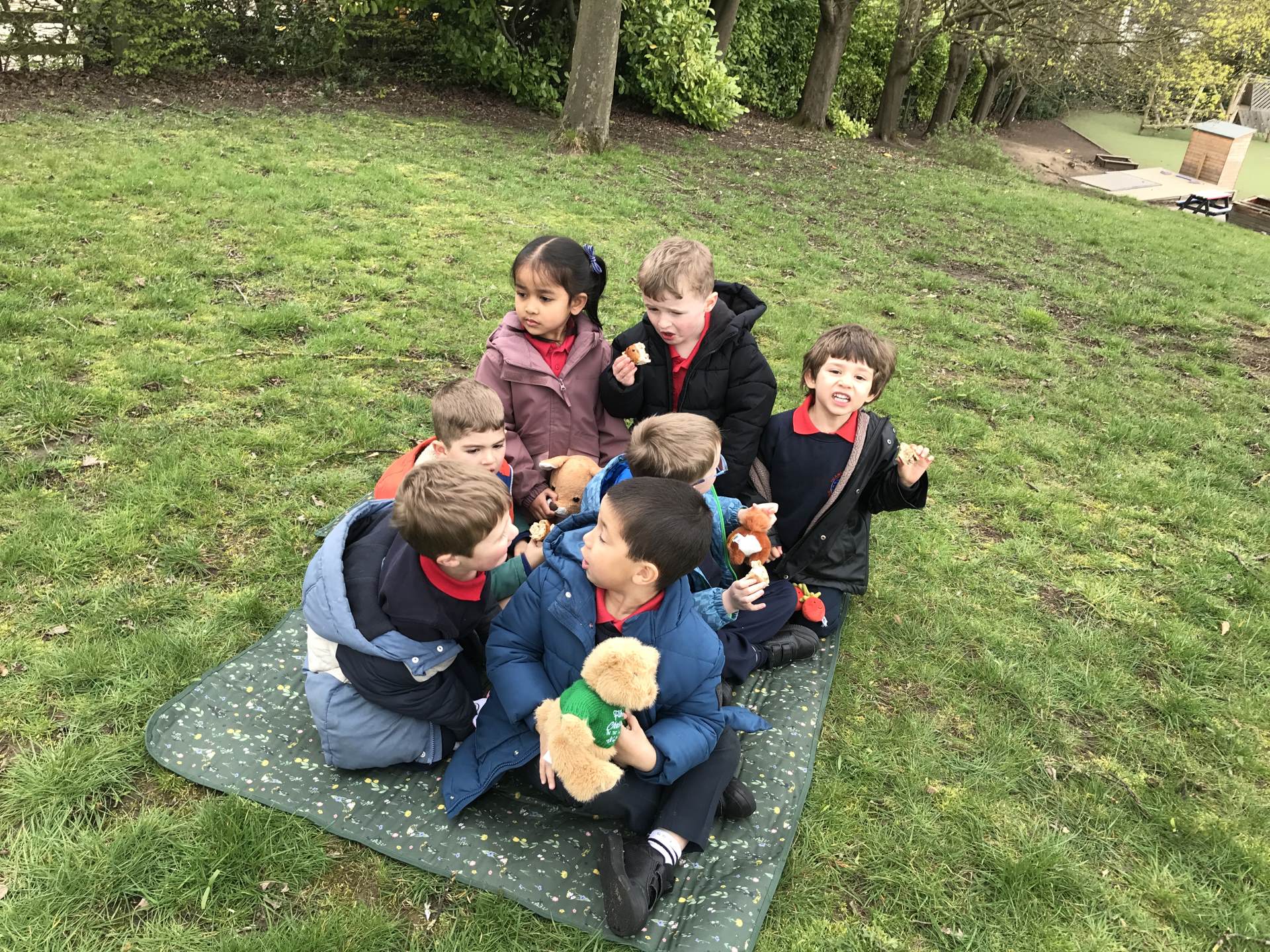 In the afternoon, we took our teddies outside and enjoyed our picnic together on the banks. The children had a lovely time sharing their food, talking with friends, and enjoying the outdoor space with their cuddly companions.