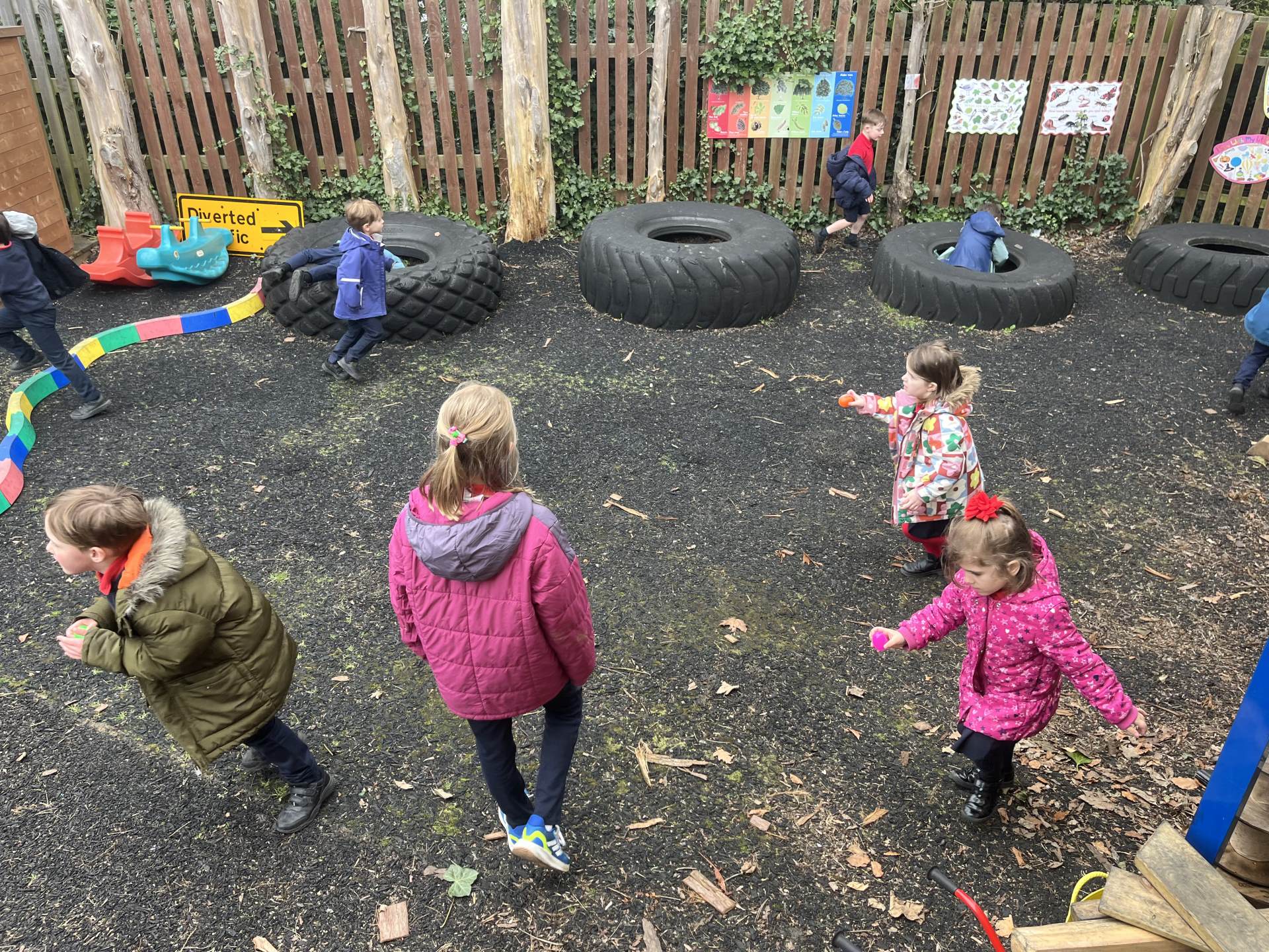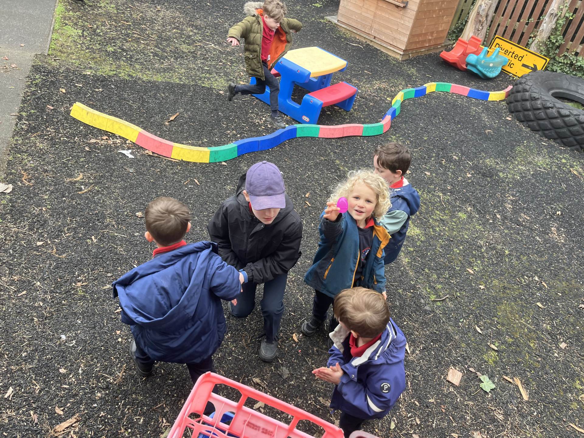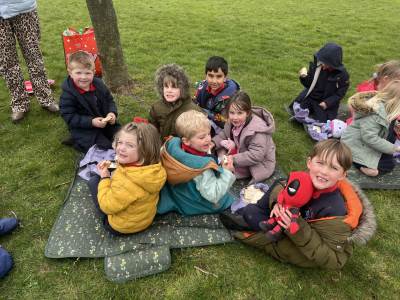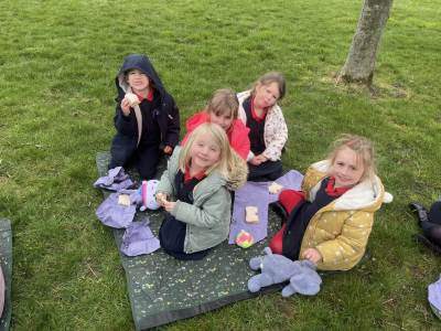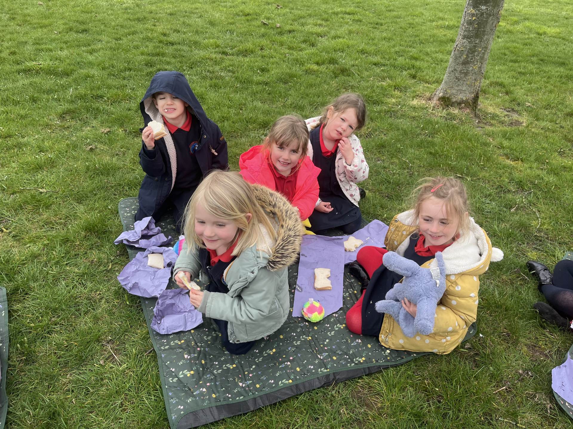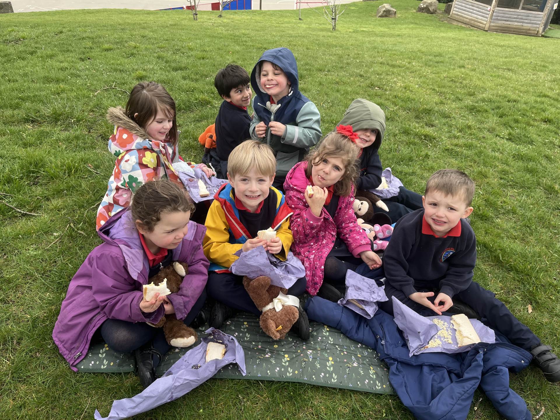In the afternoon, we took our teddies outside and enjoyed our picnic together on the banks. The children had a lovely time sharing their food, talking with friends, and enjoying the outdoor space with their cuddly companions.