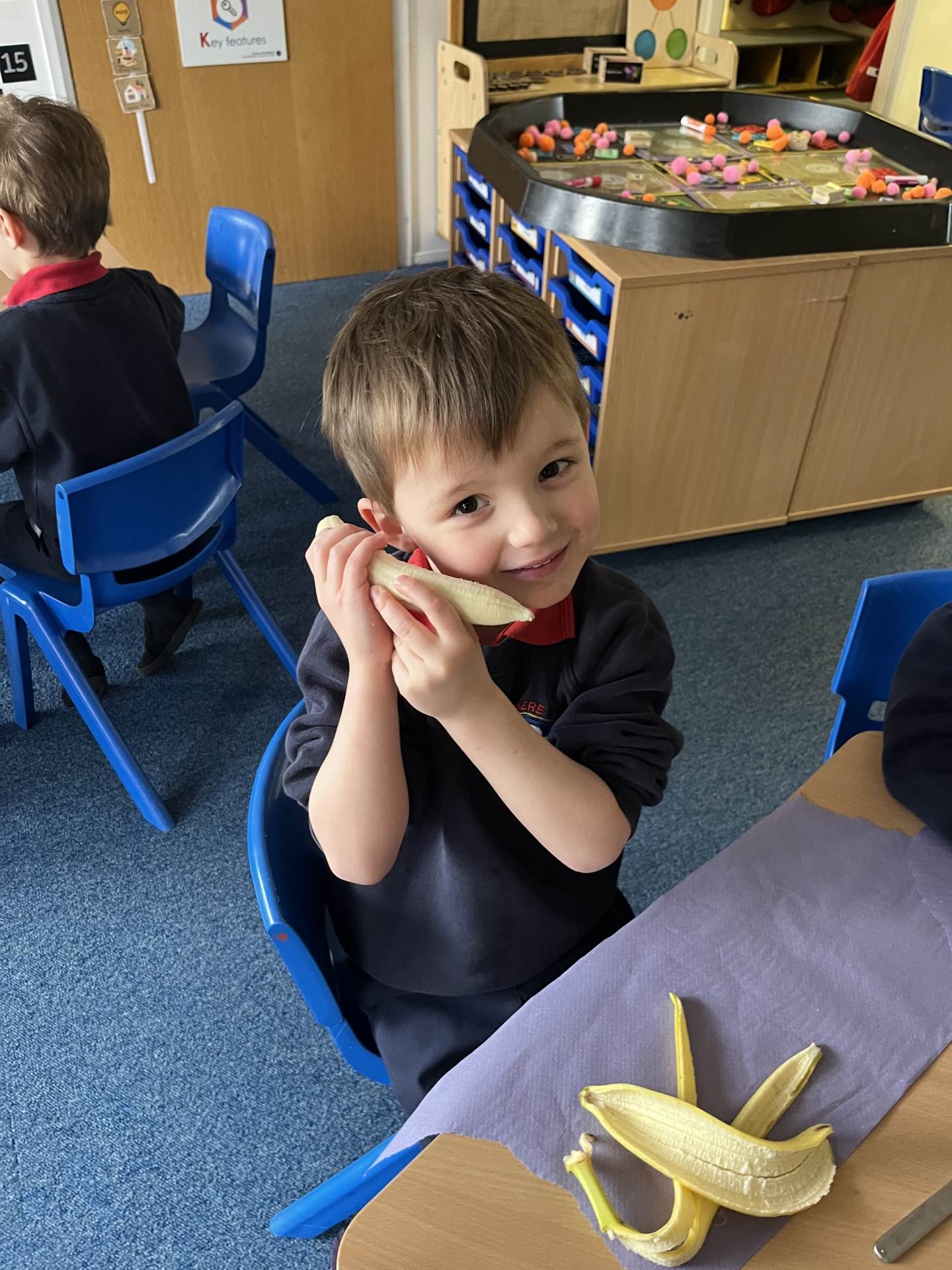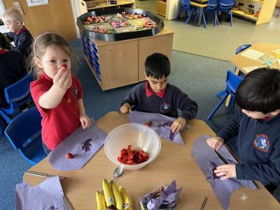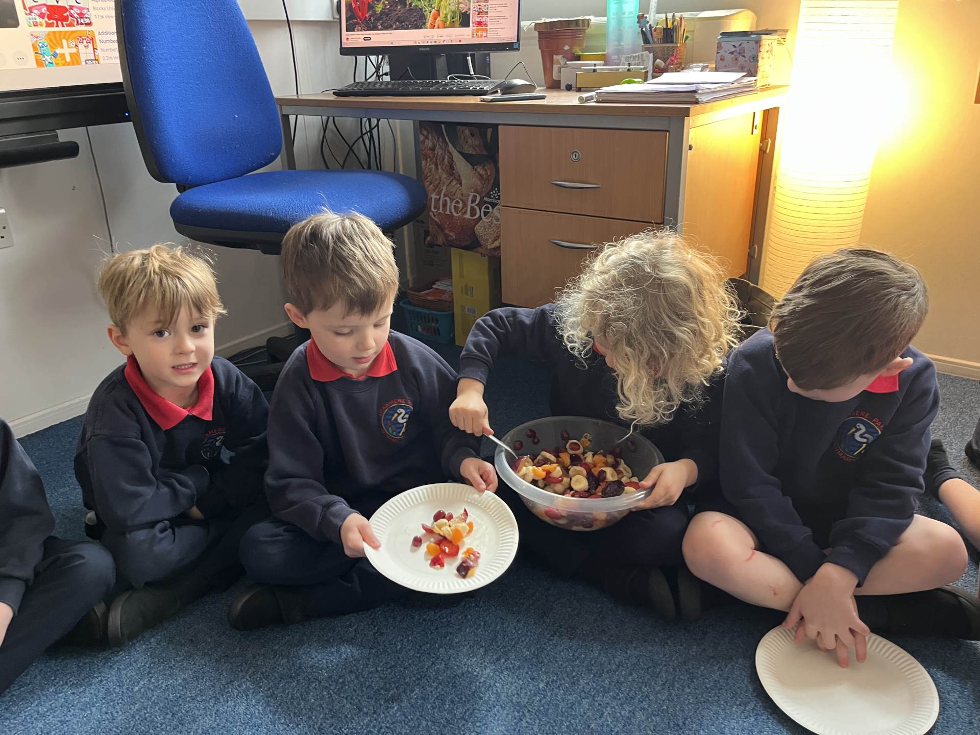 Our main task this week was to make a fruit salad using fresh fruits grown by farmers. During the activity, we talked about which fruits we were chopping, whether they were grown in England or abroad, and what it would mean if we didn’t have farmers to grow them for us.