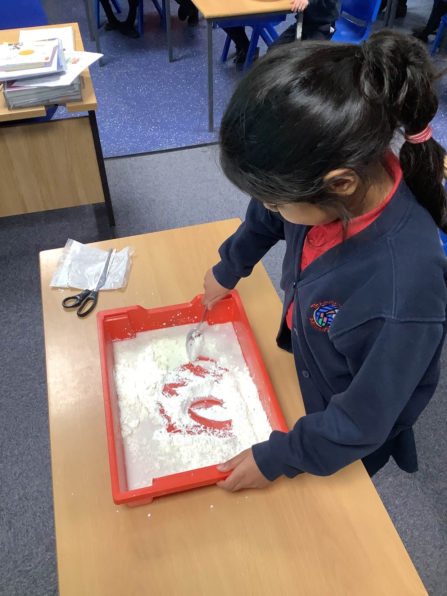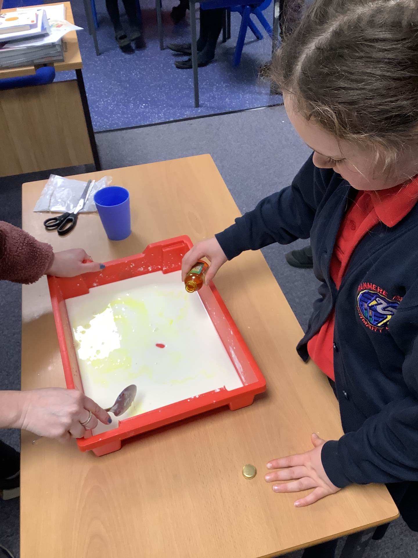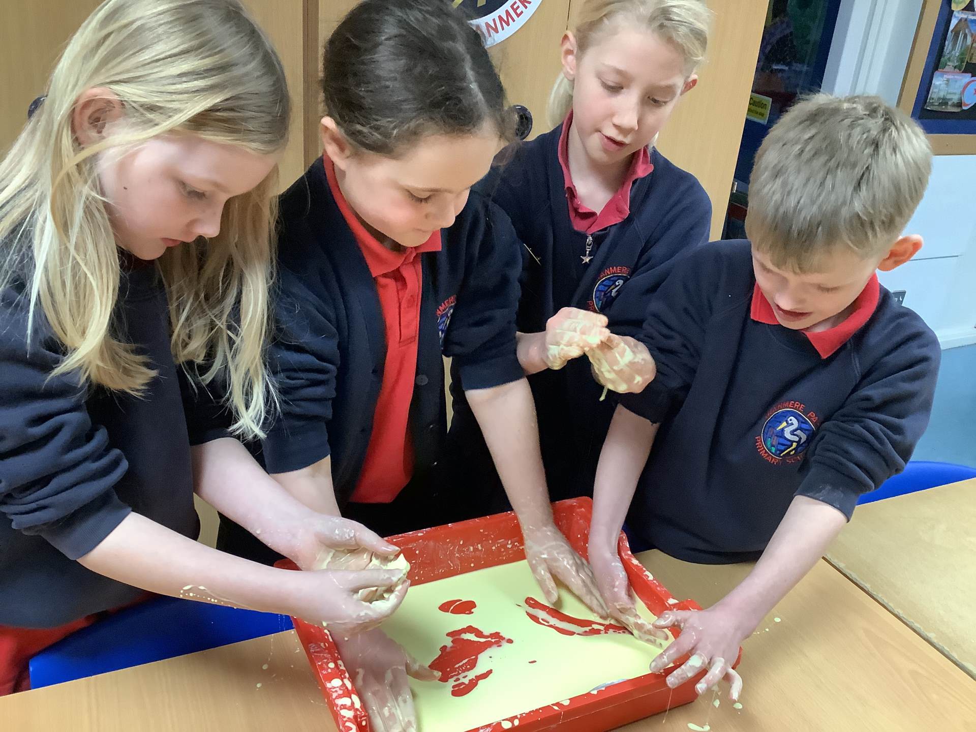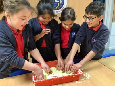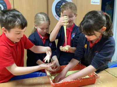 In Woodpeckers, we used corn flour, water and food colouring to create our own Non-Newtonian fluid. We spent time exploring this and discussed how it acts as a liquid and a solid depending on how much pressure you use.